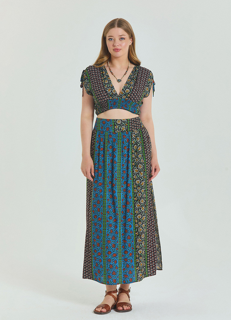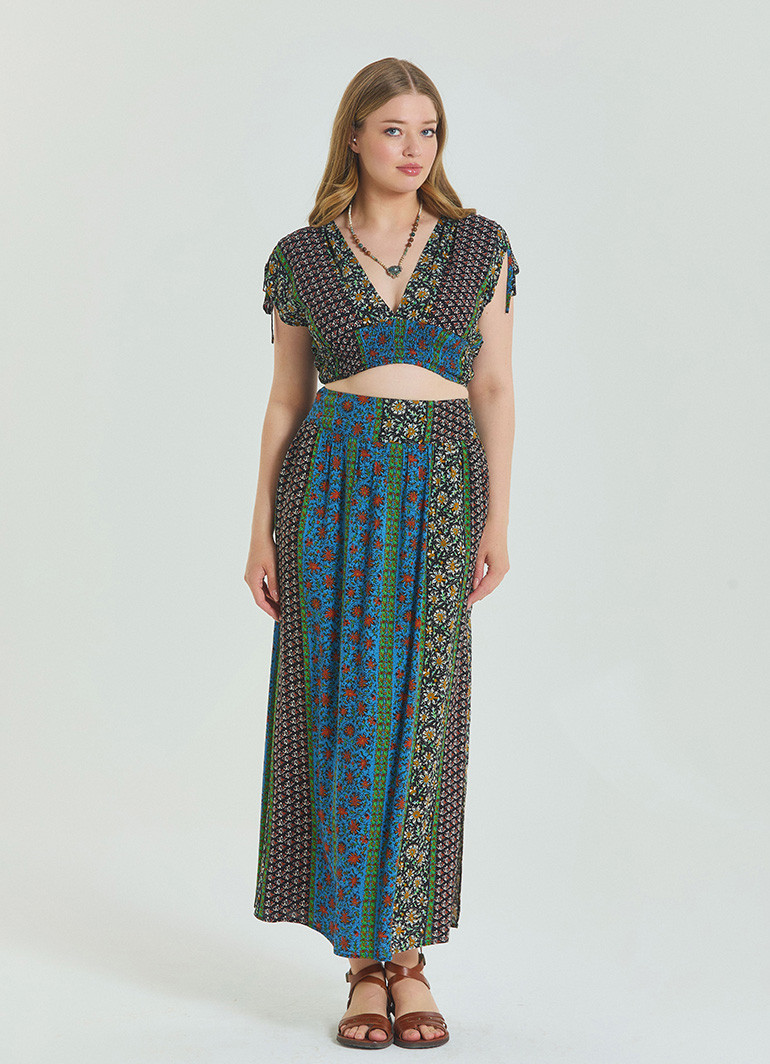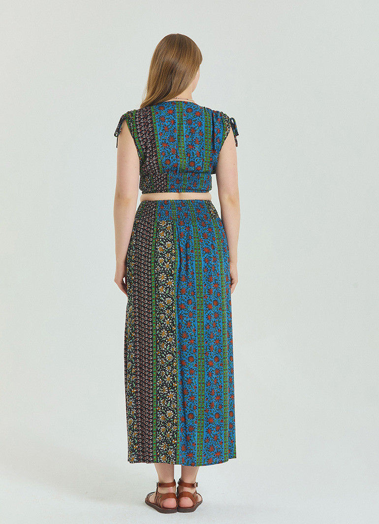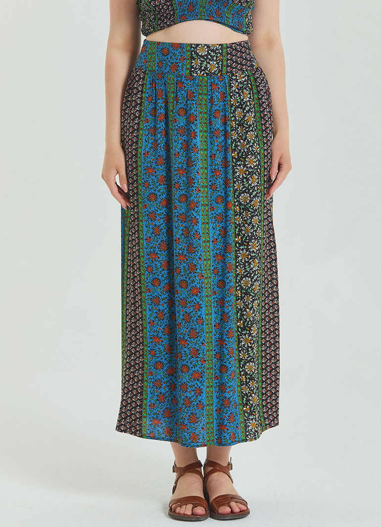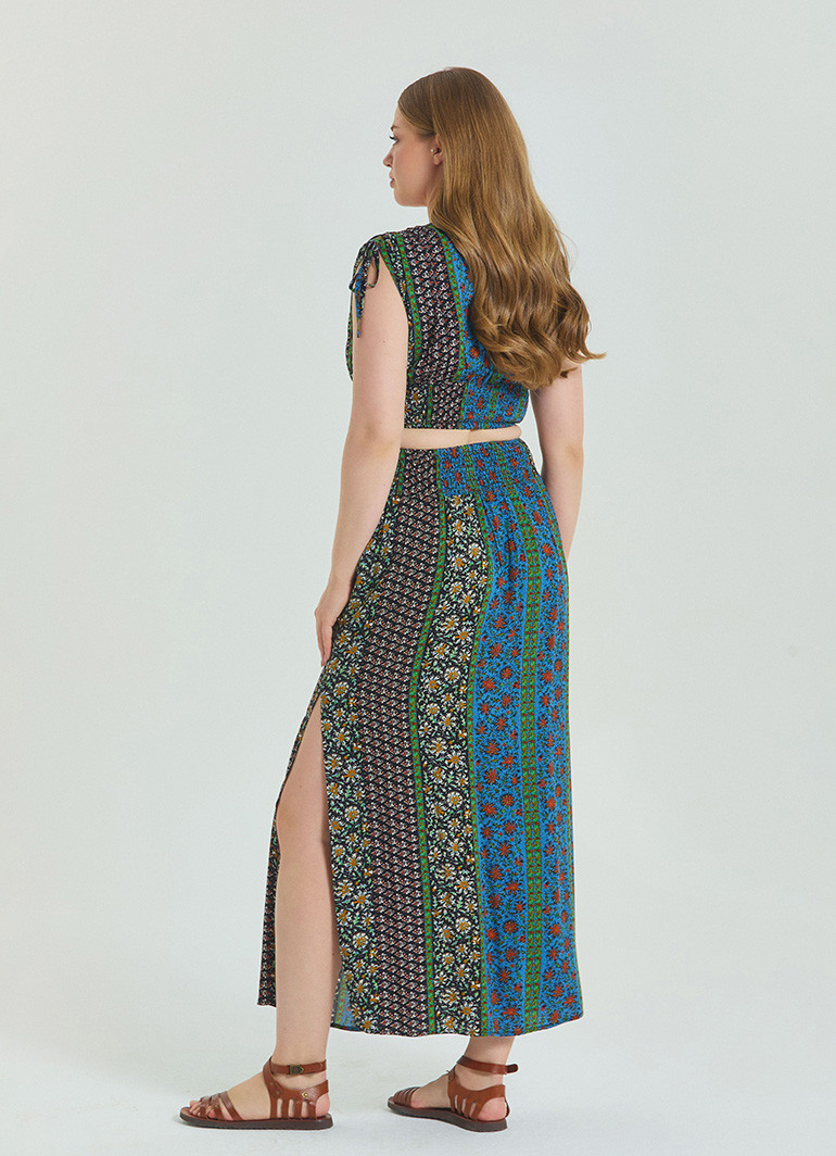 Gipe detaylı arka lastikli beli, rahatlığı ön planda tutarken belinize zarifçe oturur. Çiçek desenleriyle bezenmiş uzun kesimi, hem günlük kombinlerde hem de tatil şıklığında göz kamaştırmanızı sağlar.