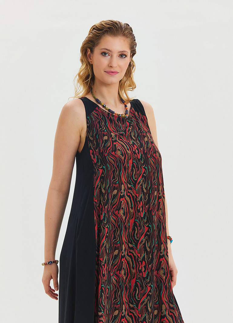 %100 dokuma viskon kumaşı, doğal kayın ağacı selülozundan üretilmiş olup terletmeyen yapısıyla konforu ön planda tutar. Bisiklet yaka ve özenle yerleştirilmiş cep detayları, elbiseye modern bir hava katarken zarif bir görünüm sunar.