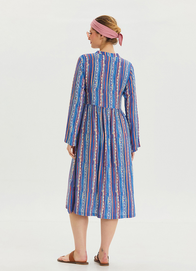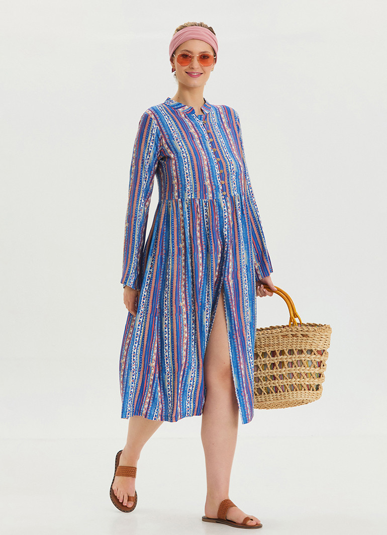 Yaz aylarının enerjisini ve ferahlığını yansıtan Bisiklet Yaka Düğme Detaylı Mavi Uzun Kolu Elbise 6761, modern tasarımıyla stilinize zarif bir dokunuş katar.