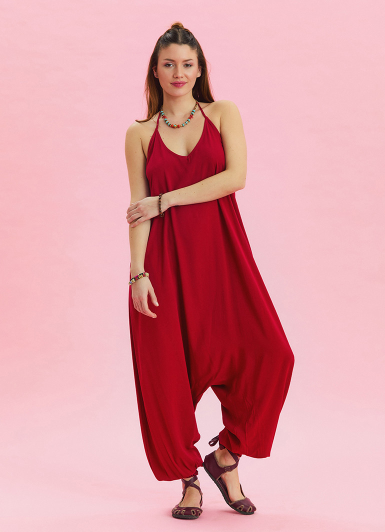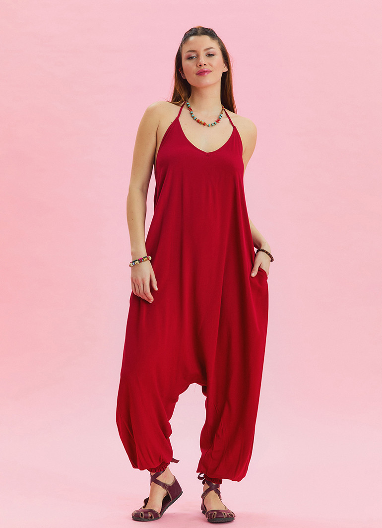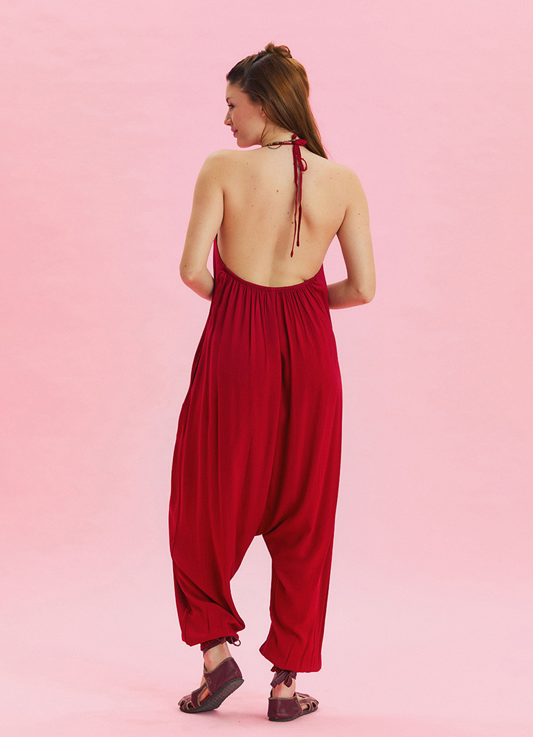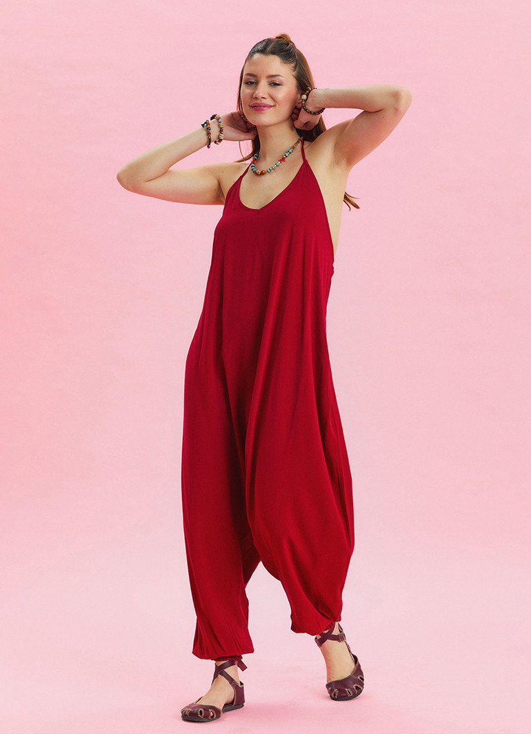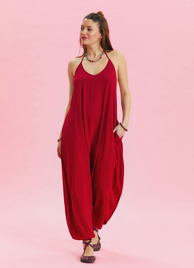 Boyundan Bağlamalı Pacası Lastikli Kırmızı Kadın Yazlık Tulum 6804