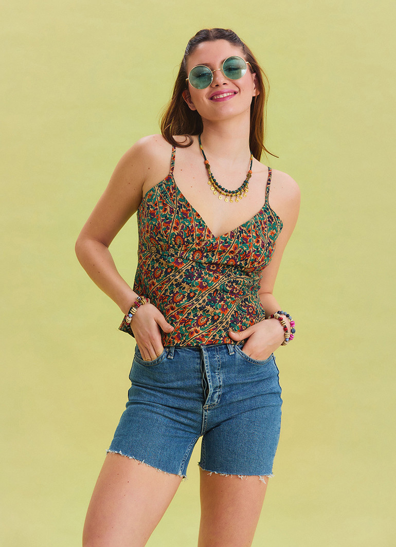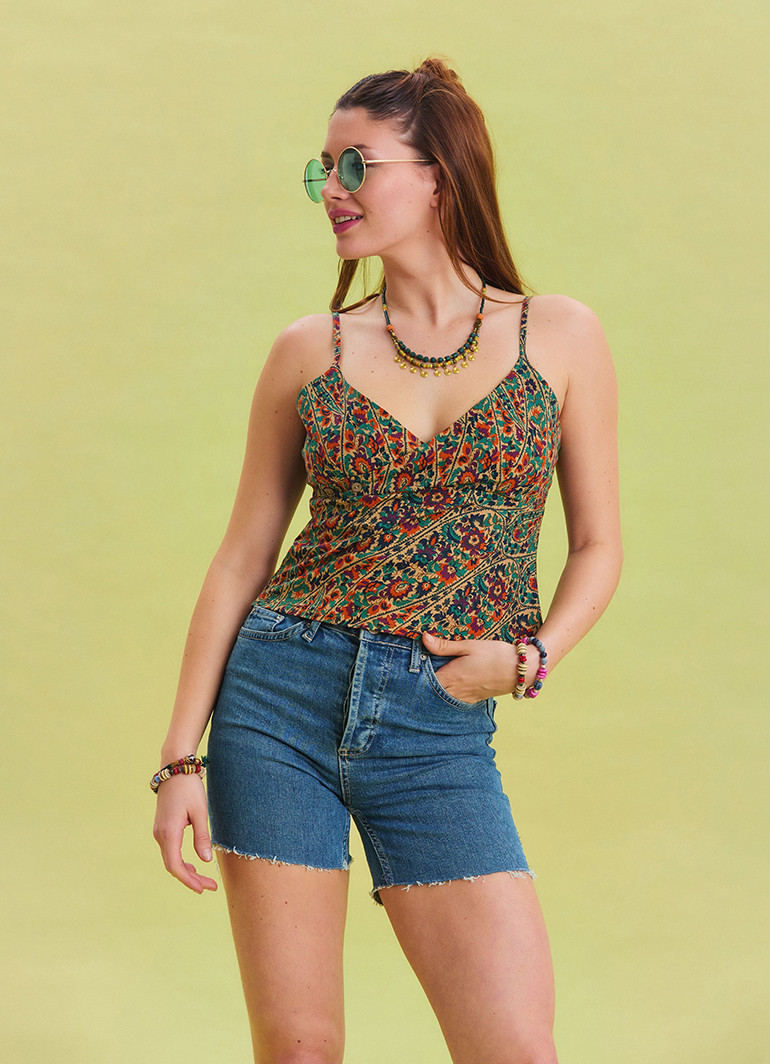 Çiçek Desenli İnce Askılı Ayarlanabilir Yeşil Crop Bluz 6757, yaz sezonunun vazgeçilmezi olacak modern ve şık bir tasarıma sahiptir. V yaka kesimi ve düğme detayları, bluzun zarafetini ön plana çıkarır.