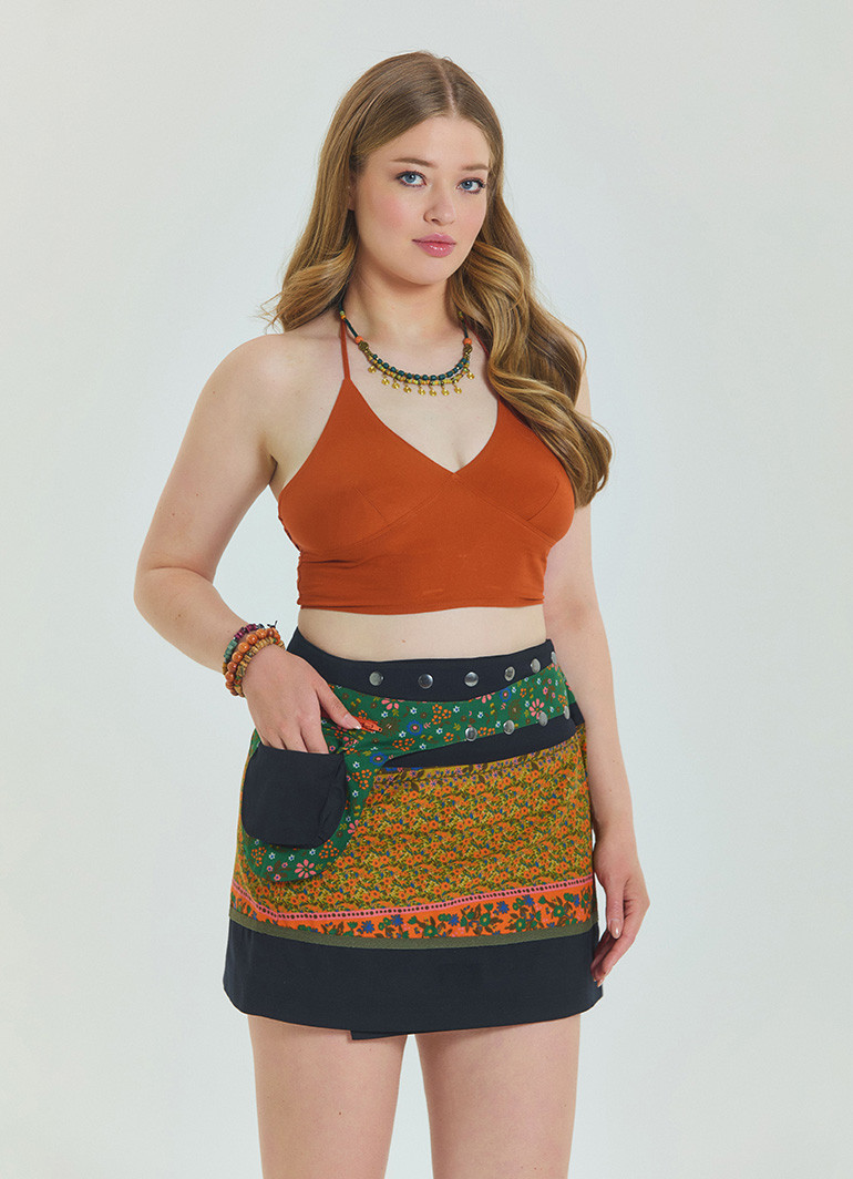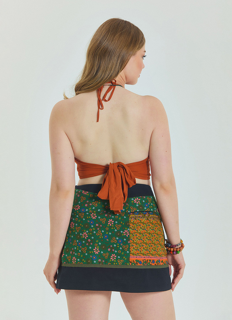 Yeşil tonlarının doğadan ilham alan enerjisiyle tasarlanan patchwork detaylar, eteğe bohem bir hava katar. Cep detayları hem şıklığı artırır hem de fonksiyonel bir kullanım imkânı sunar.