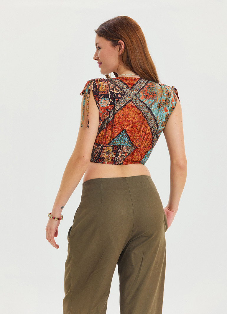 Ayarlanabilir bağcıklı kol detayı, yazlık crop bluzun dinamik havasını yansıtıyor; gipeli bel tasarımı sayesinde vücudunuza tam oturarak rahatlık ve şıklığı bir arada sunuyor.