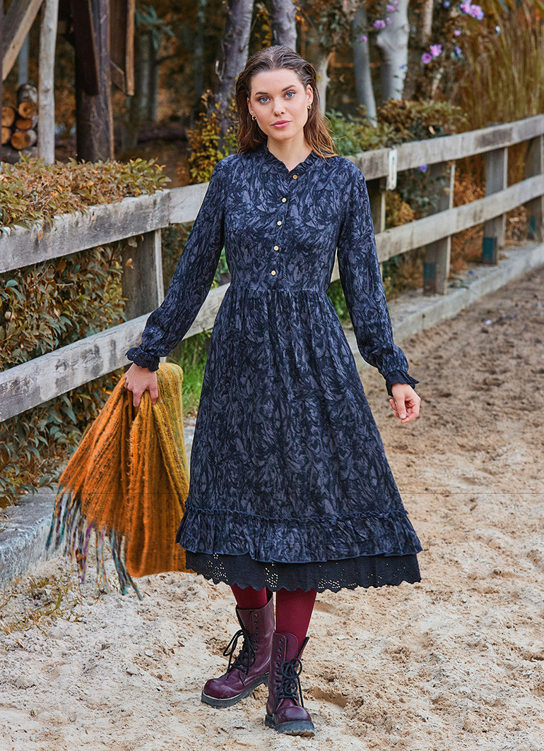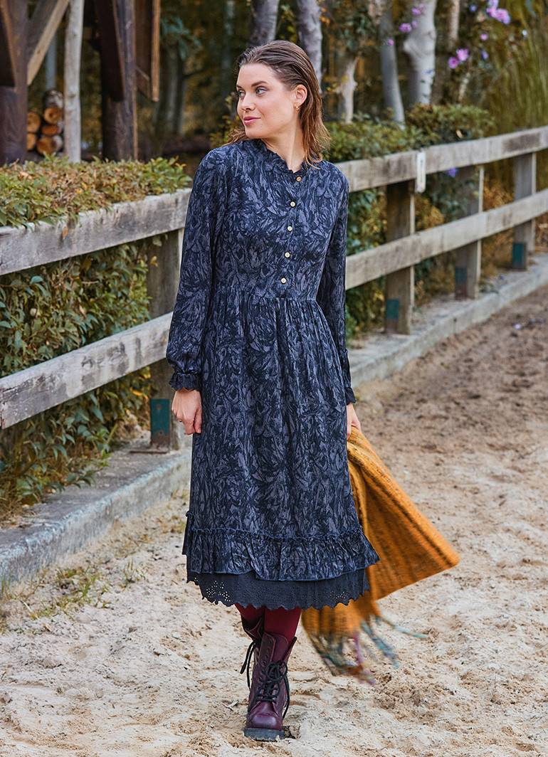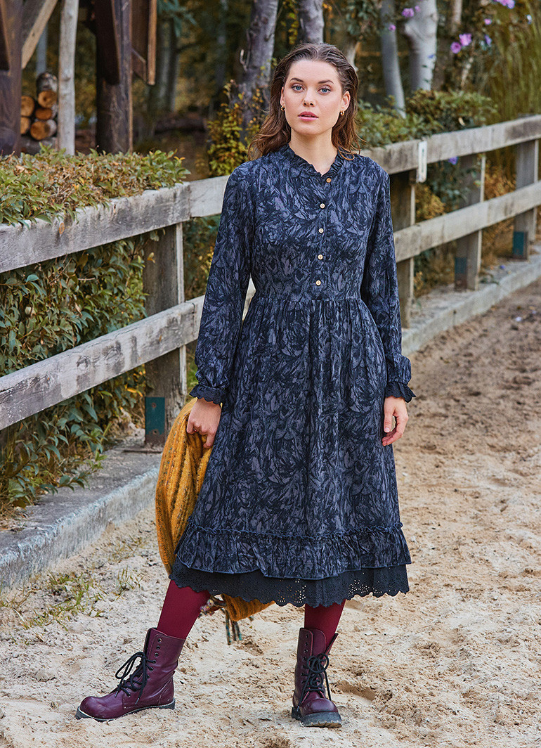 Özenle tasarlanmış dantel detayları ve düğme süslemeleri, elbiseye zarif bir dokunuş katarken, uzun kolları sayesinde soğuk günlerde konfor sunar.