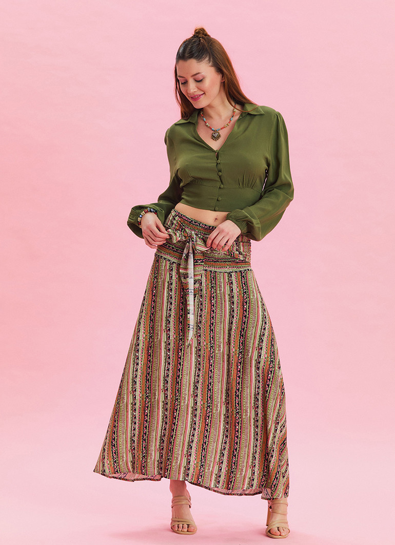 Gipe Belden Bağlamalı Haki Desenli Uzun Etek 6828