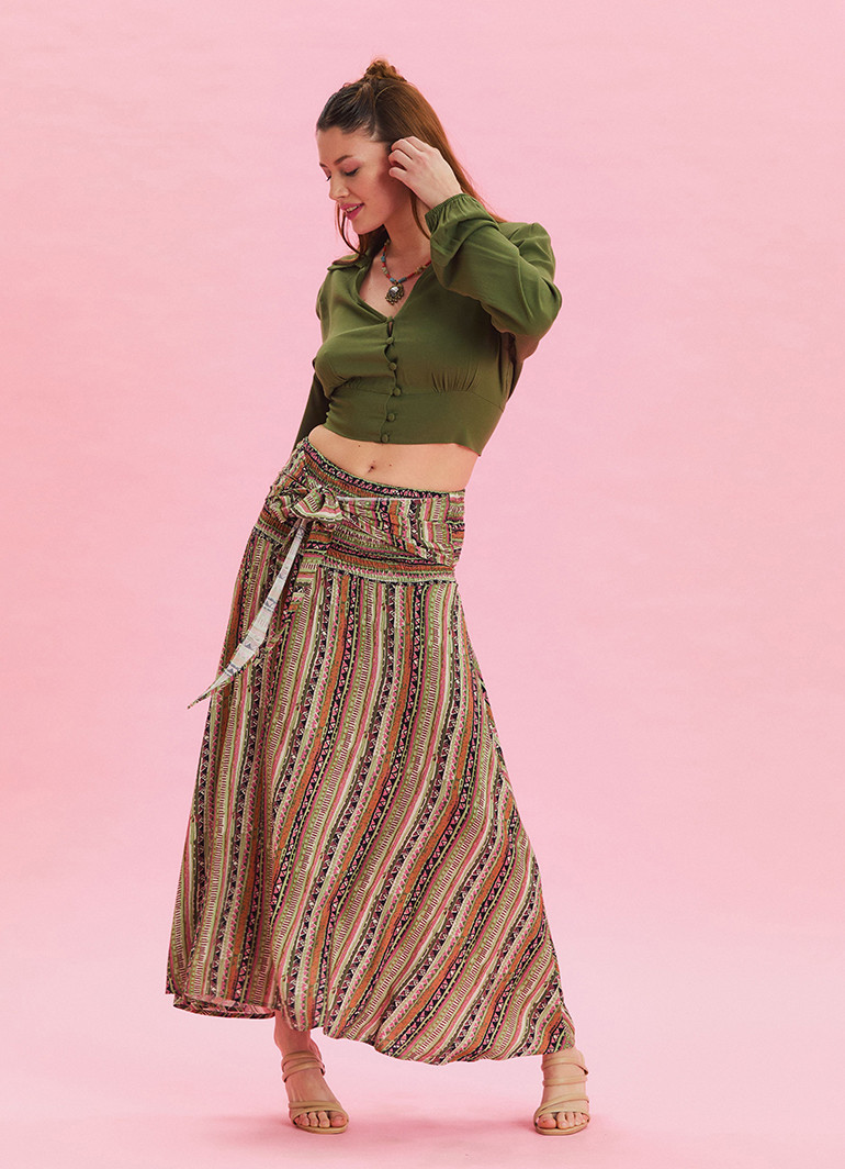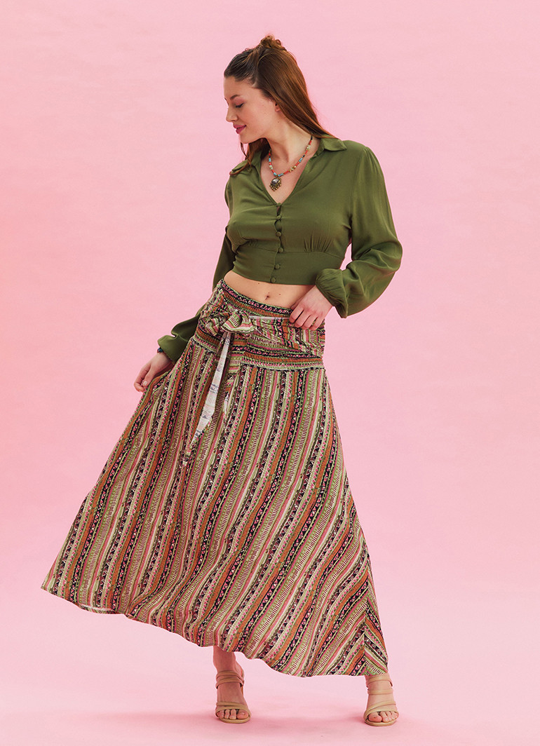 Modern çizgilerin ve zarif detayların buluştuğu Gipe Belden Bağlamalı Haki Desenli Uzun Etek 6828, yazın enerjisini yansıtan eşsiz bir tasarıma sahiptir.