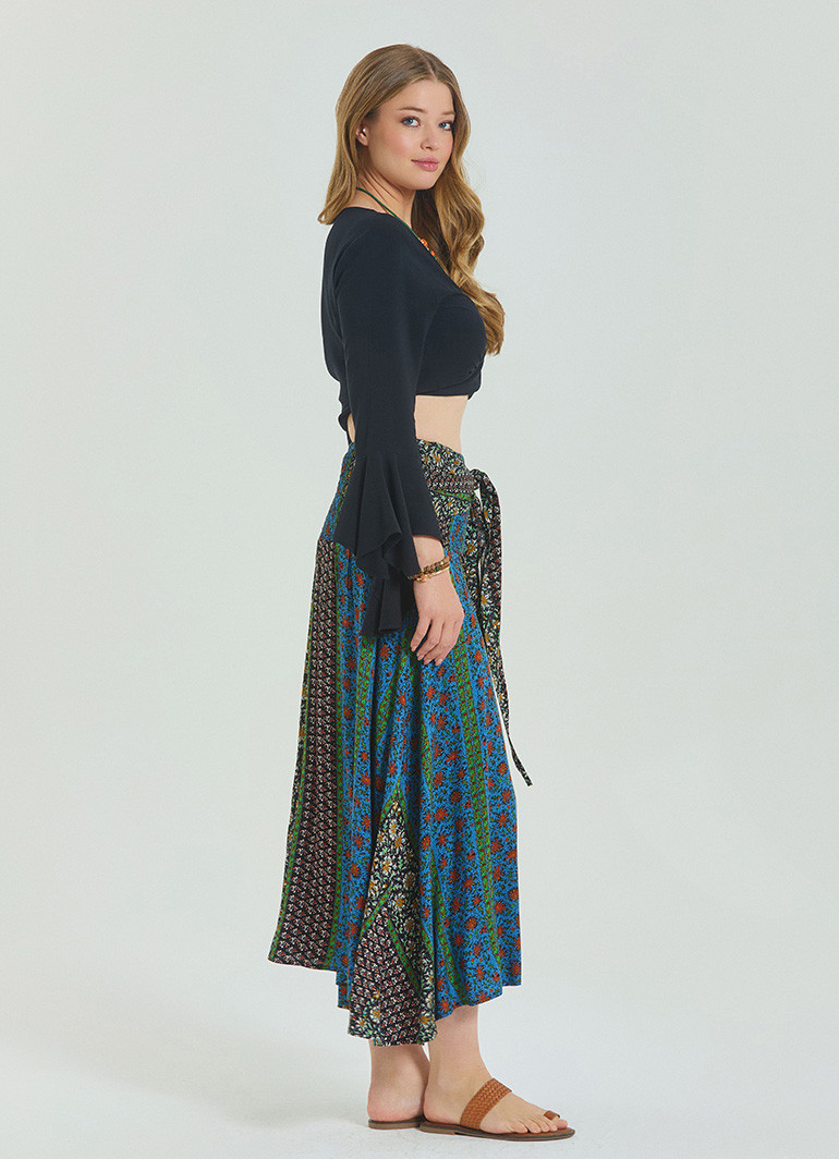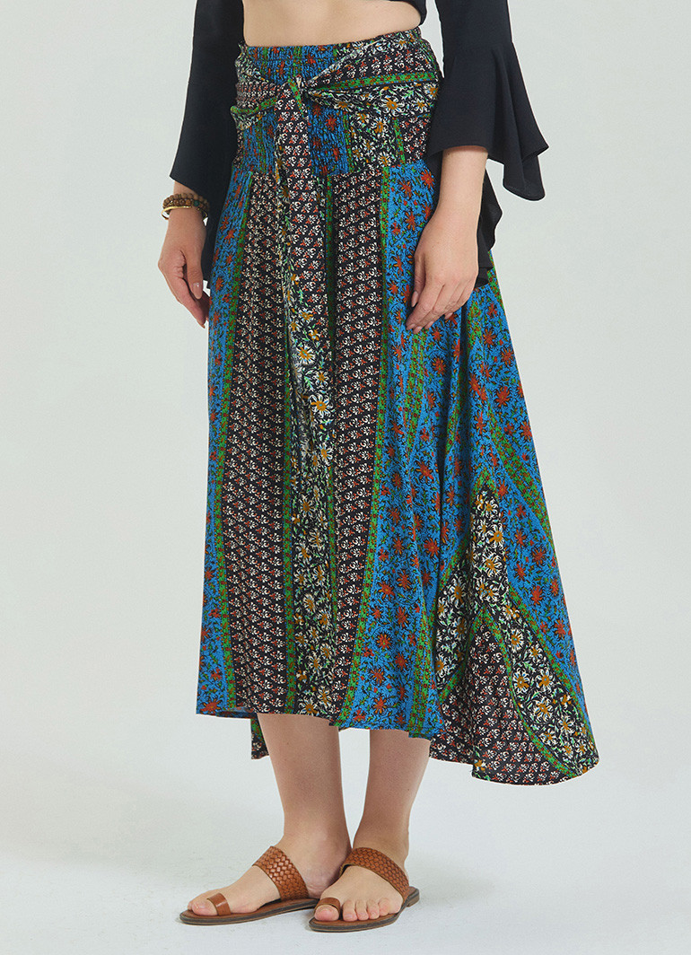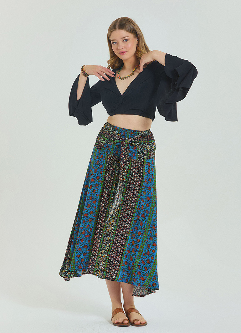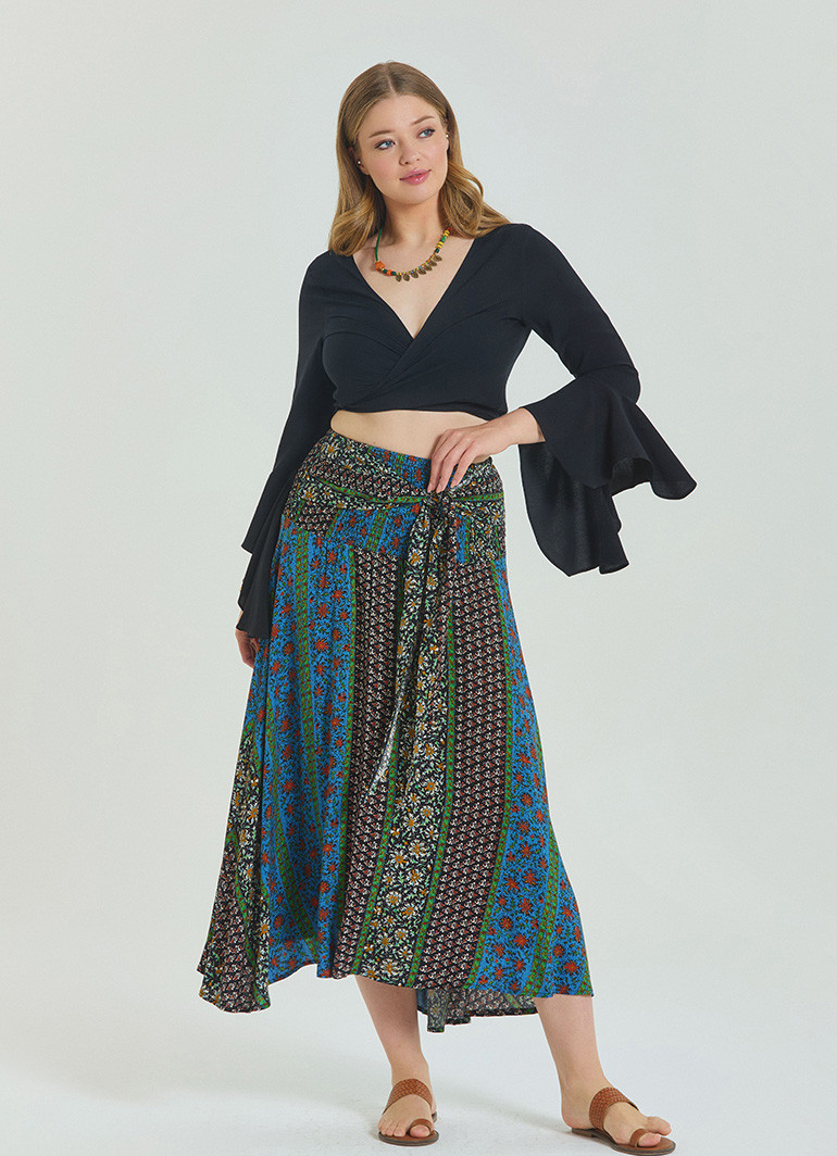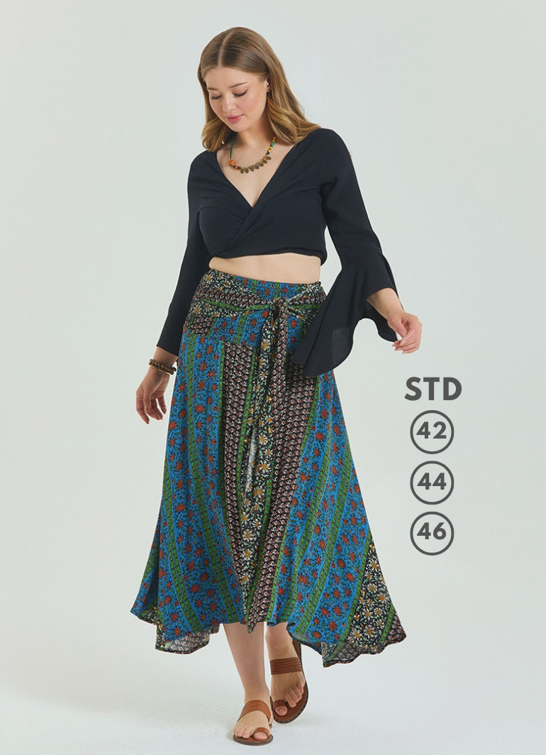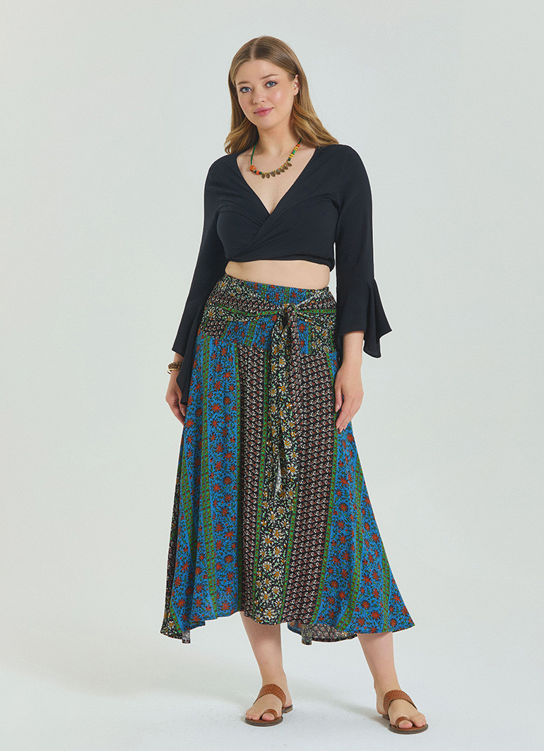Yaz gardırobunuzun vazgeçilmezi olacak Gipe Belden Bağlamalı Lacivert Büyük Beden Etek, akıcı viskon kumaşıyla gün boyu ferahlık sağlar.
