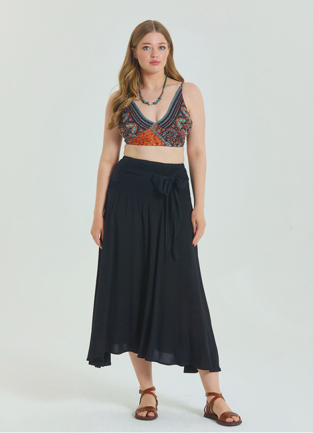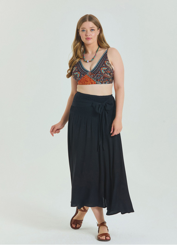 Gipe detaylı tasarımıyla hareket özgürlüğü sunan büyük beden siyah yazlık etek, zarif görünümünüzü ön plana çıkarır.