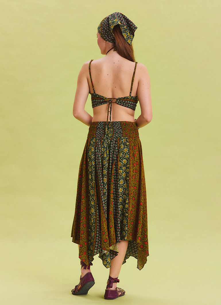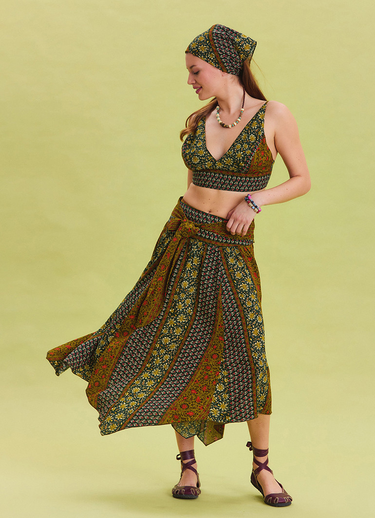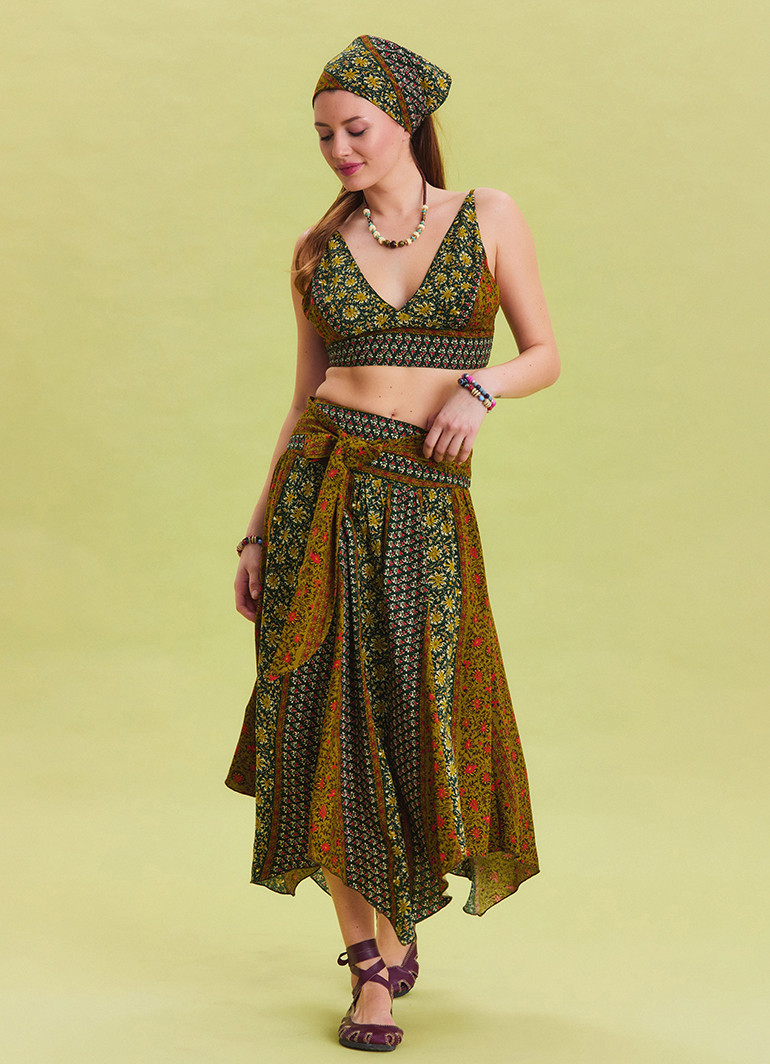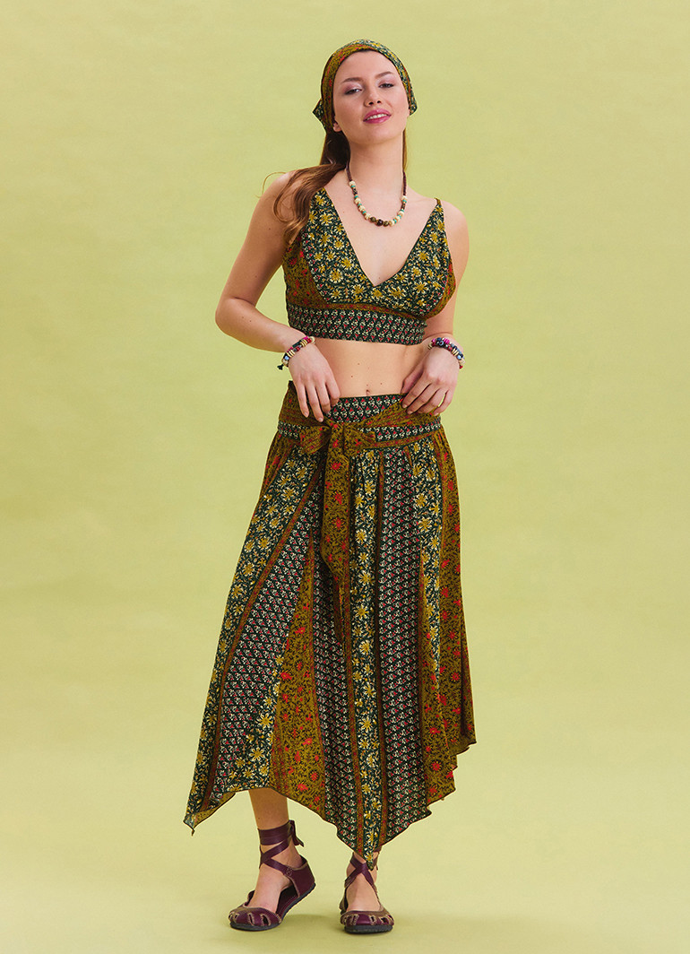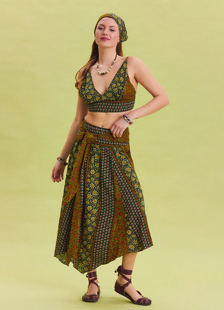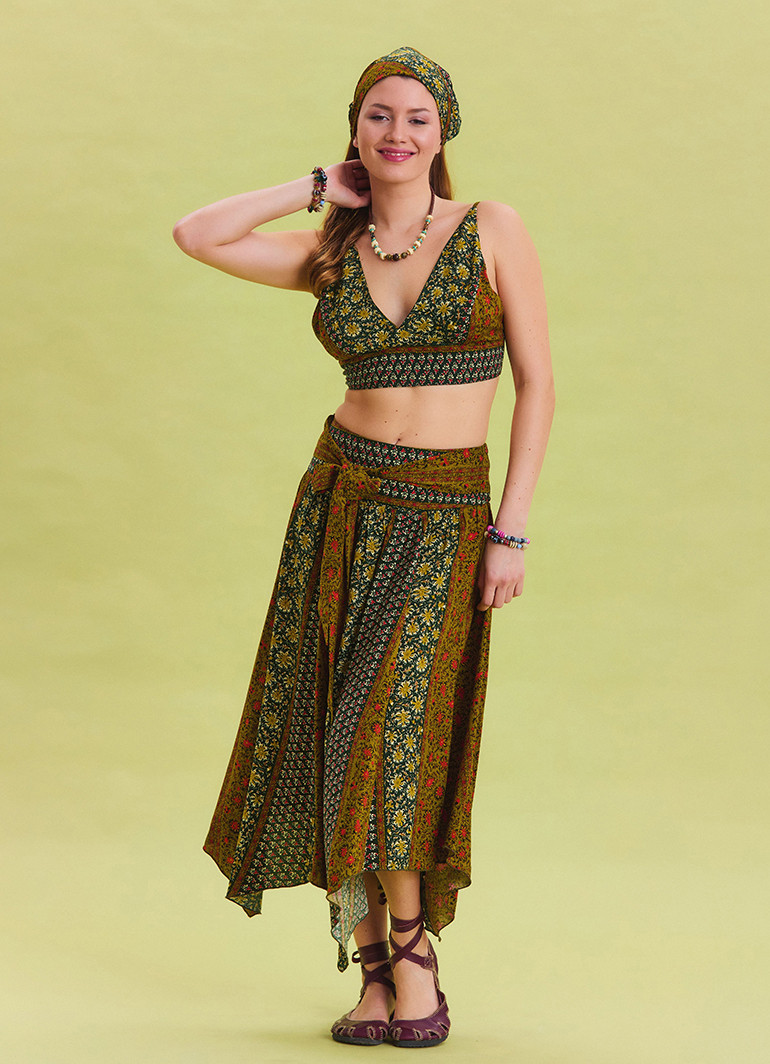 Şıklığı ve zarafeti bir araya getiren Gipe Detaylı Beli Bağlamalı Yeşil Desenli Asimetrik Etek 6835, modern kadının stiline yenilikçi bir dokunuş sunuyor. Asimetrik kesimi ve özenle işlenmiş gipe detayları, her adımda fark yaratır.