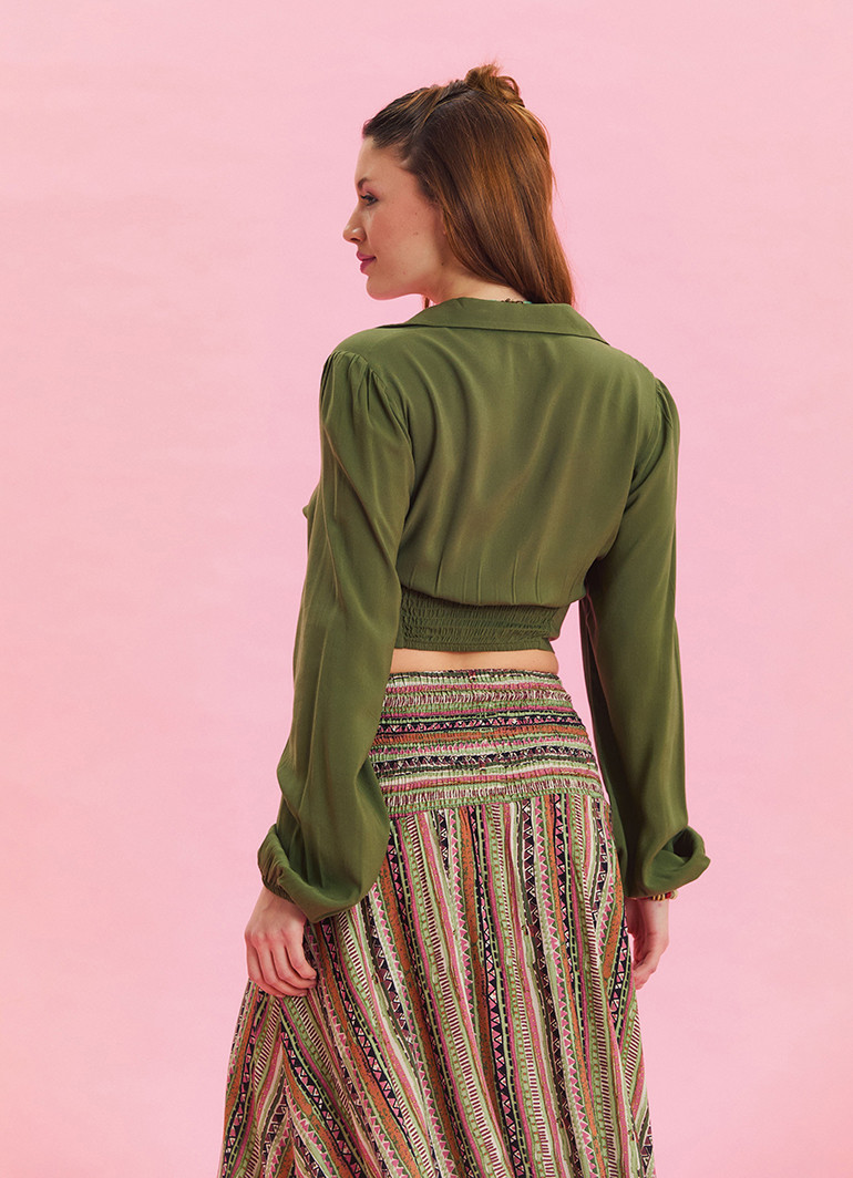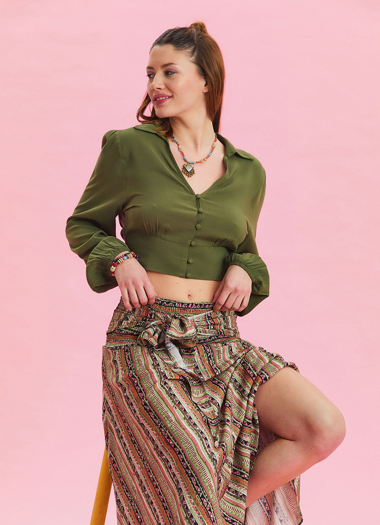 Gömlek Yaka Düğme Detaylı Haki Bohem Bluz 6751, zarif bohem tarzı ve modern detaylarıyla dolabınıza şıklık katıyor. İnce dokuma viskon kumaşı sayesinde hafif, dökümlü ve ferah bir kullanım sunar.