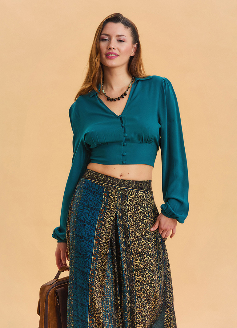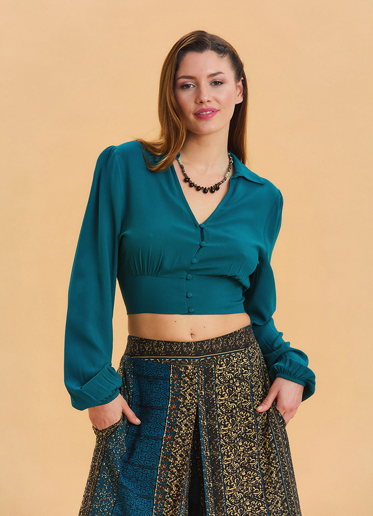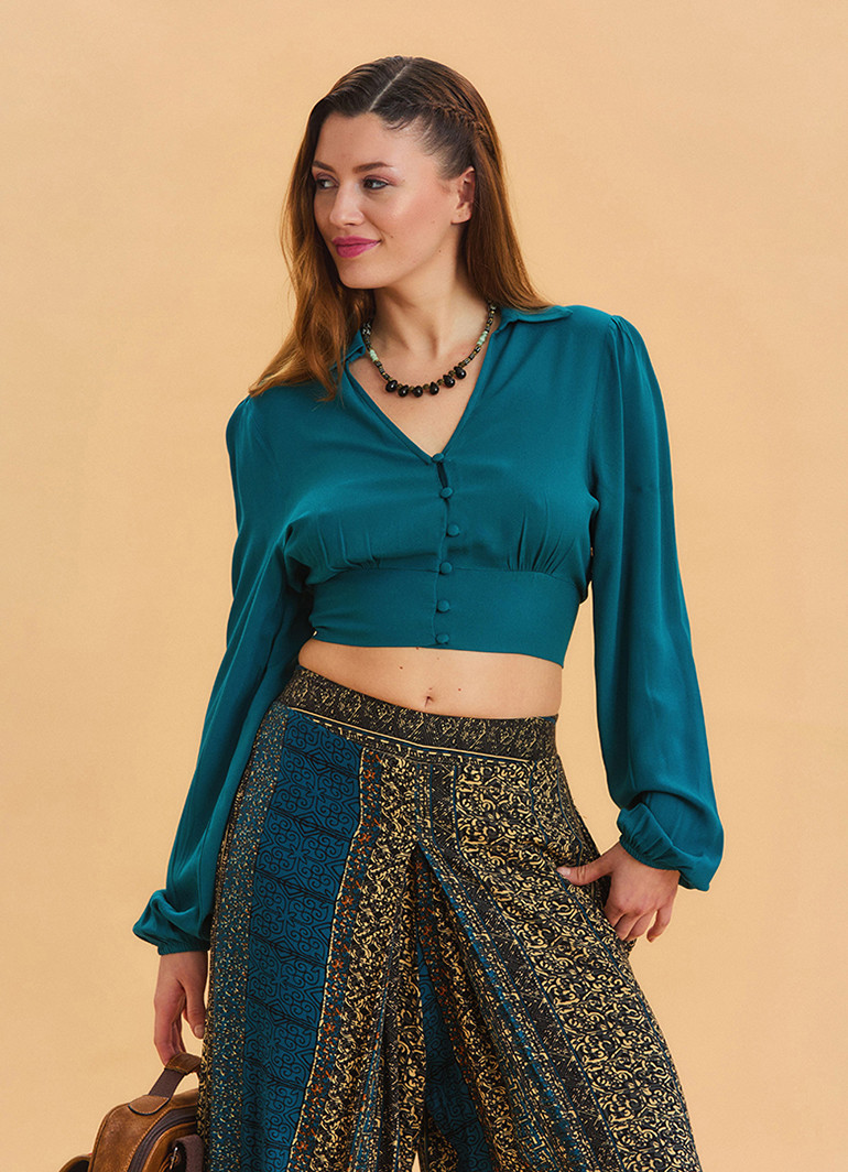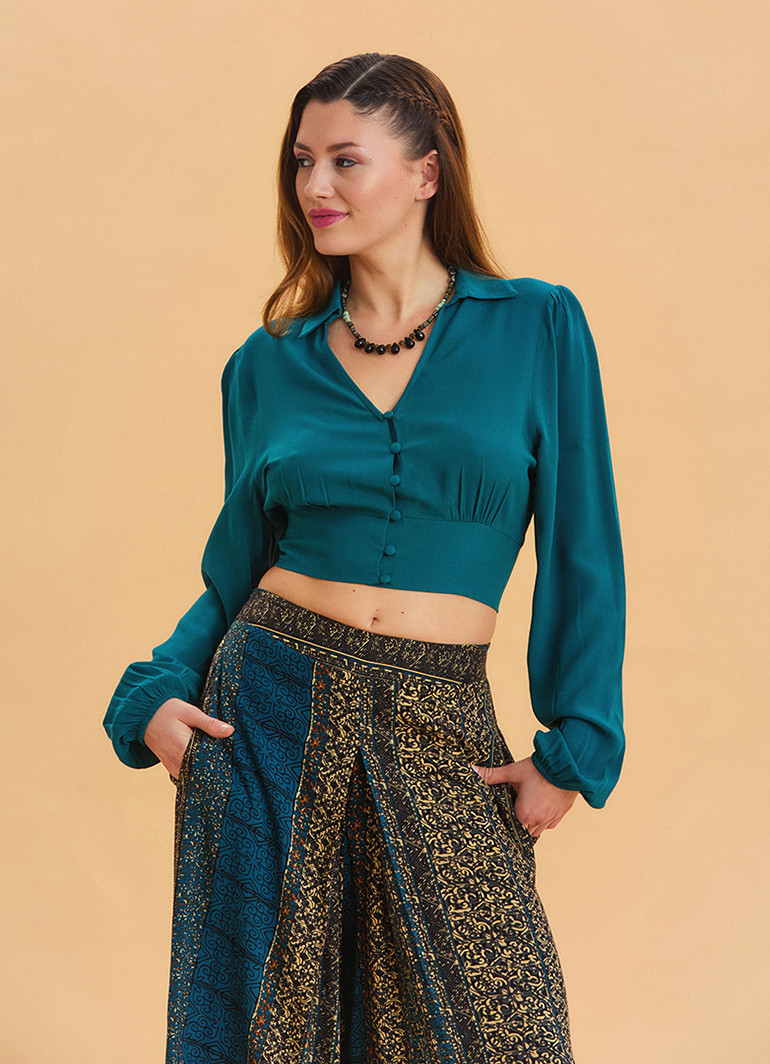 Gömlek Yaka Düğme Detaylı Petrol Crop Bluz 6750, modern tasarımı ve zarif detaylarıyla stilinizi tamamlayan şık bir seçenektir. Yumuşak ve hafif %100 viskon kumaşı sayesinde nefes alabilir ve terletmez. İnce düğme detayları ve gömlek yaka tasarımıyla hem resmi hem de gündelik kombinlere uyum sağlar.