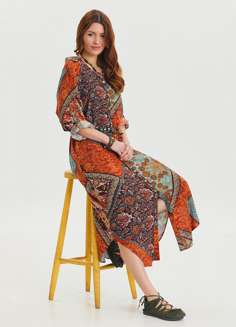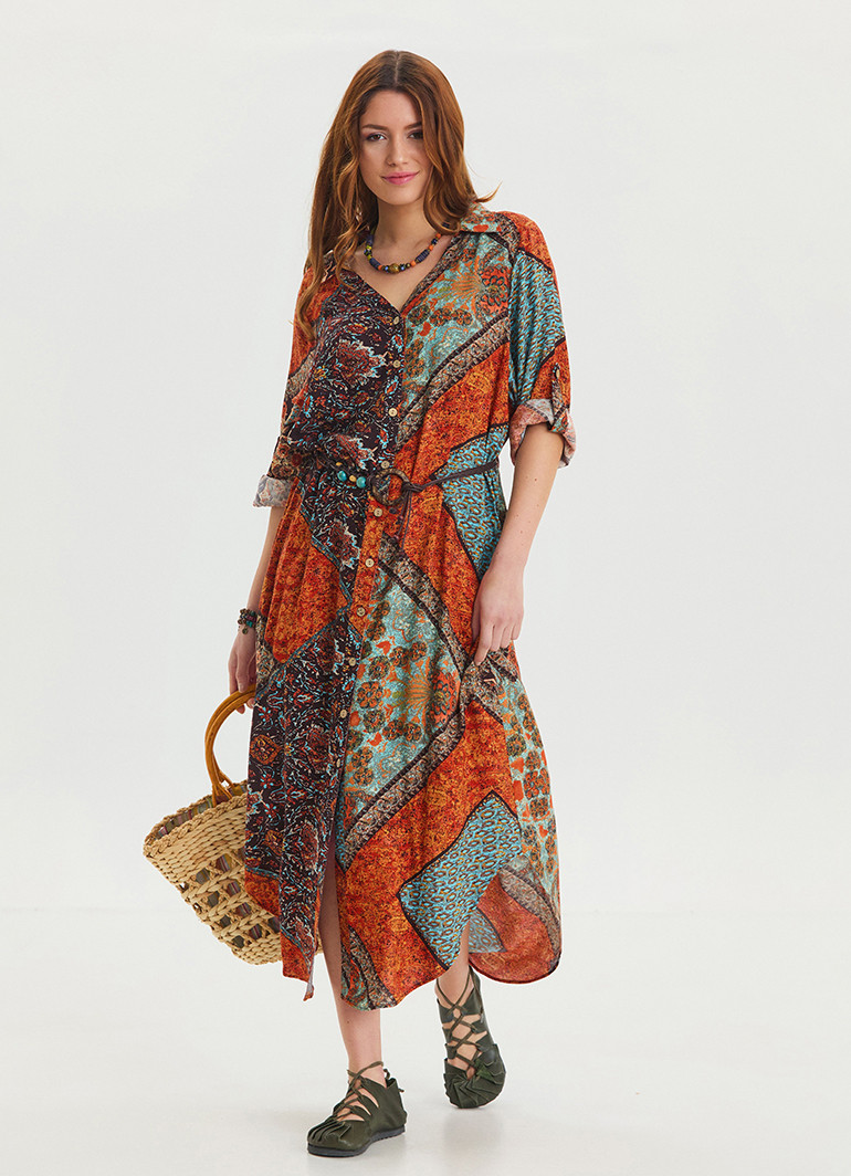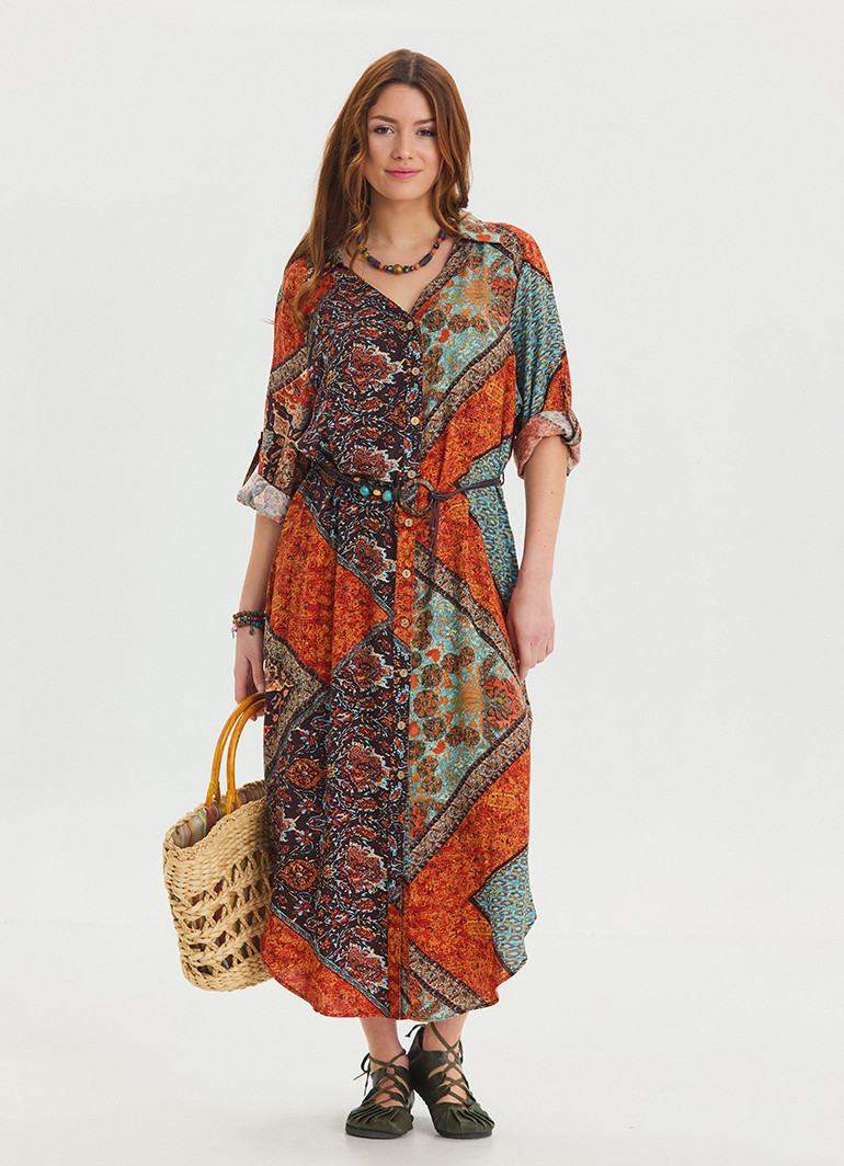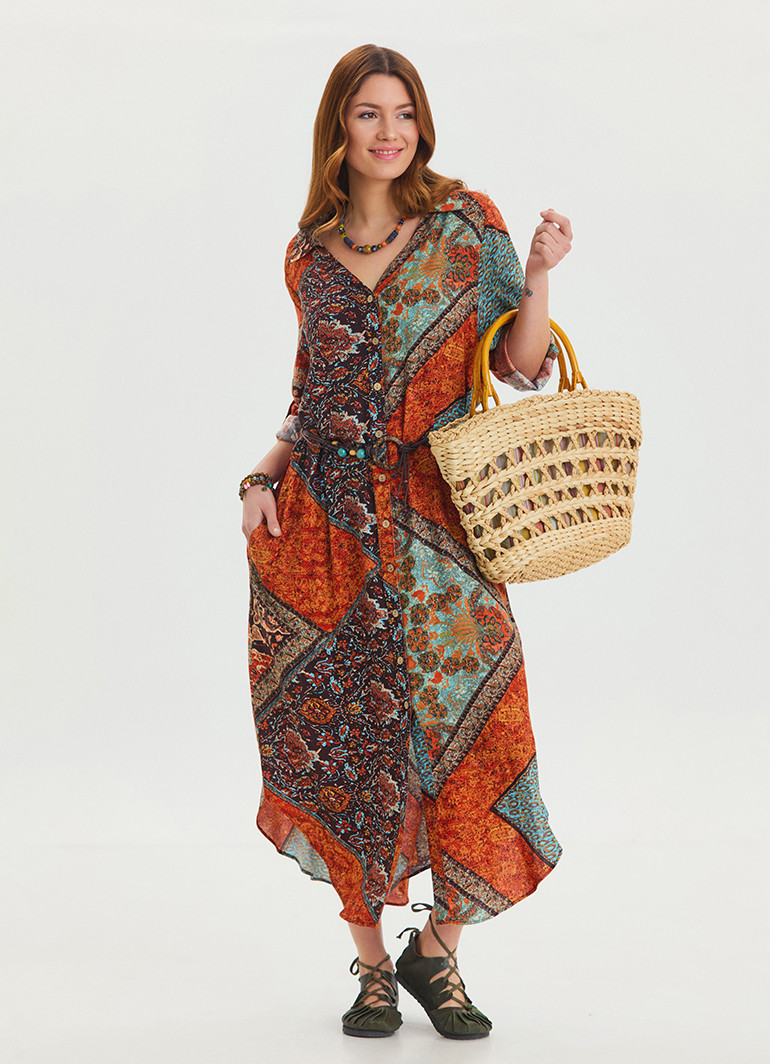 Gömlek yaka detayları ve kemer vurgusuyla öne çıkan bu kahve desenli salaş elbise, zarafet ve rahatlığı bir araya getiriyor.