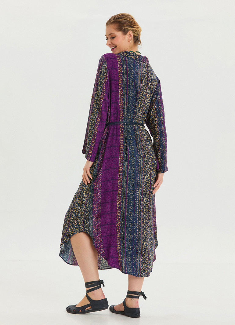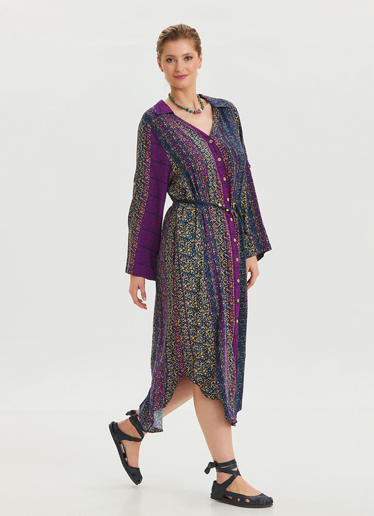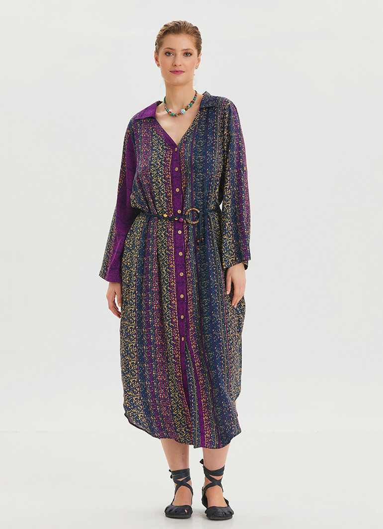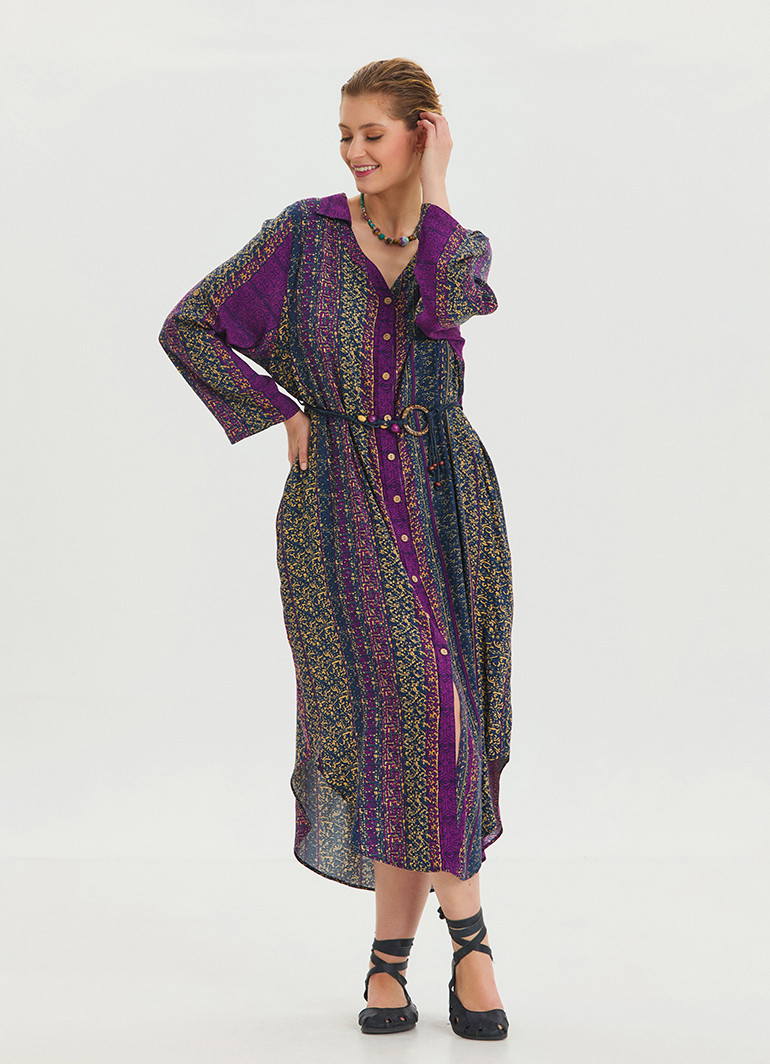 Gömlek yaka, kemer detaylı ve mor desenli uzun kollu elbise, modern ve zarif tasarımıyla öne çıkıyor. Şıklığına şıklık katan bu model, stil sahibi kadınların gözdesi olmaya aday.