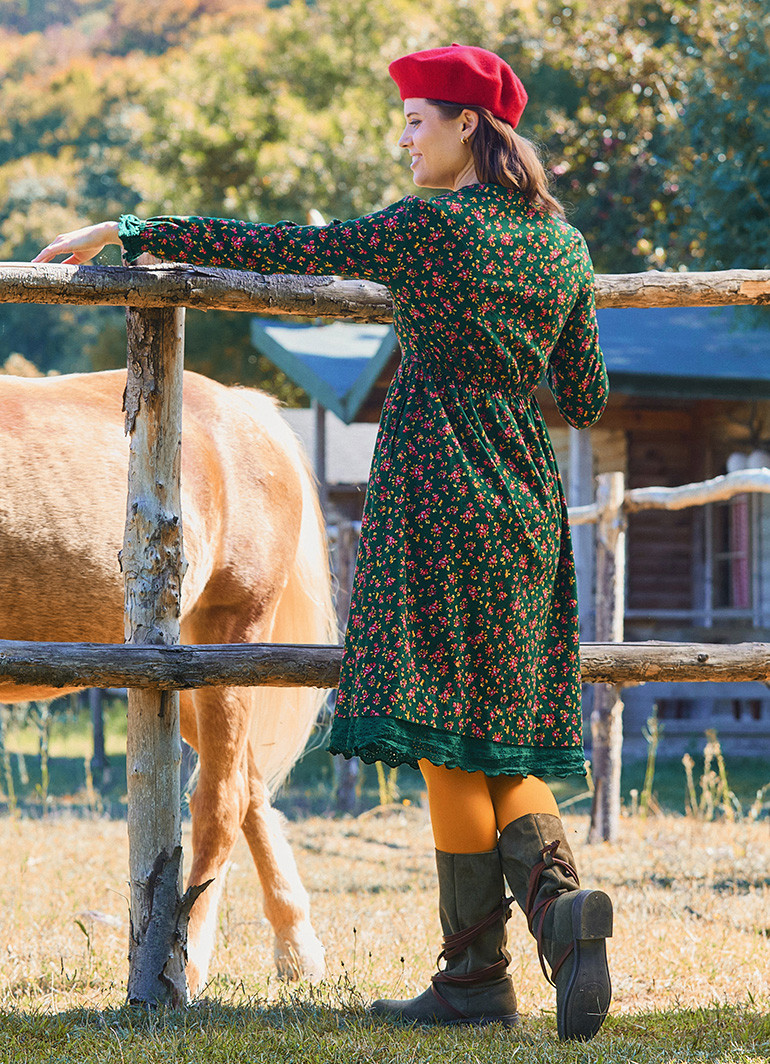 Şıklığı ve zarafeti bir araya getiren Hakim Yaka Beli Lastikli Dantelli Yeşil Çiçekli Elbise, gardırobunuza zamansız bir dokunuş katıyor. Zarif dantel detayları ve çiçek desenleriyle feminen bir görünüm sunarken, hakim yaka ve düğmeli ön tasarımıyla klasik bir şıklık sağlıyor.
