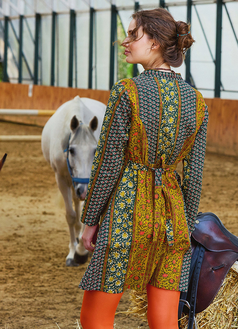 Hakim Yaka Düğme Detaylı Bağlamalı Yeşil Çiçekli Elbise 7052