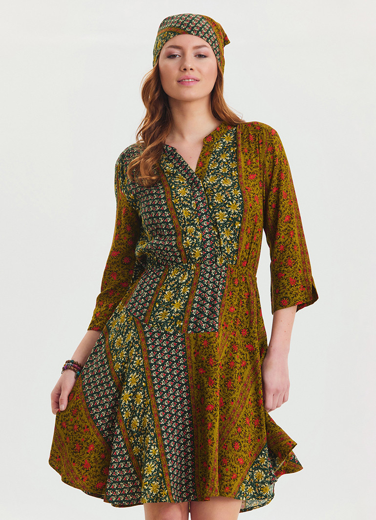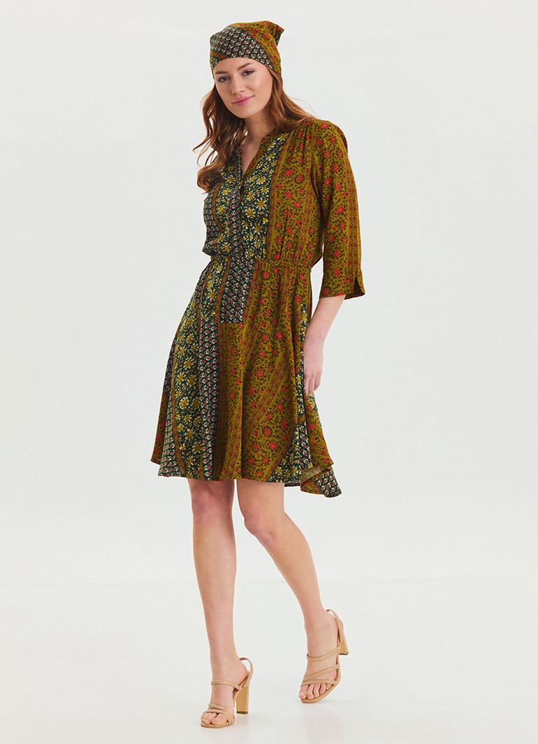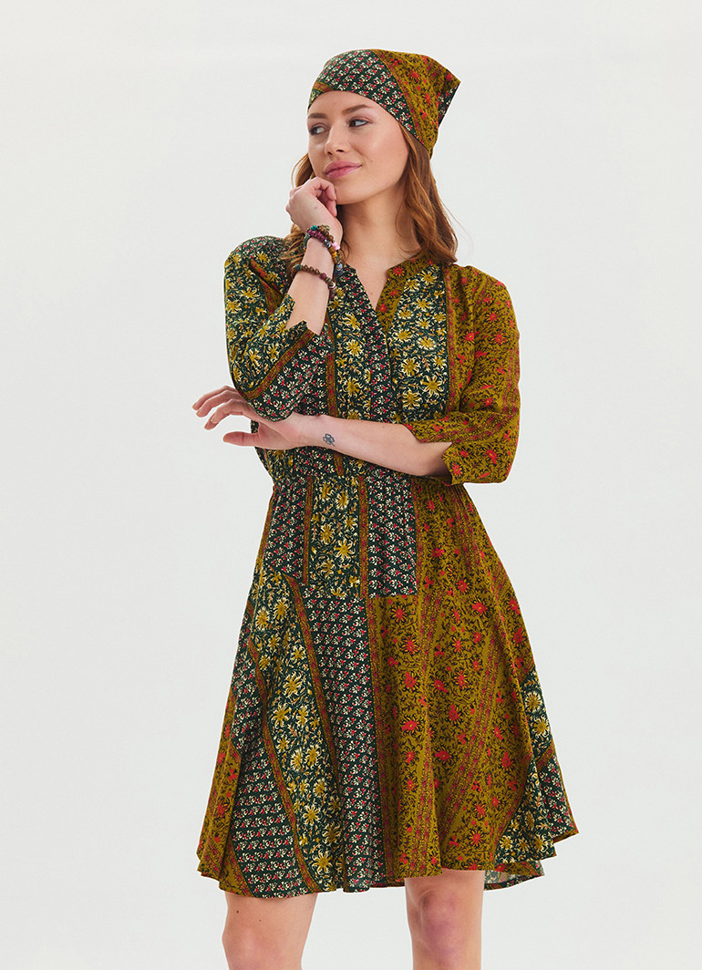 Düğme detayları ve hakim yaka tasarımı, elbiseye modern bir dokunuş katarak vücut hatlarınızı ön plana çıkarır; yeşil desen ise enerjik ve canlı bir görünüm sunar.