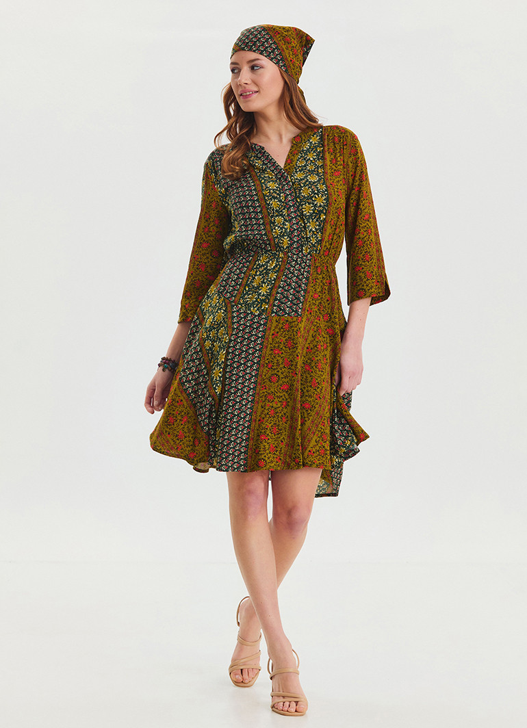 Hakim Yaka Düğme Detaylı Yeşil Desenli Midi Elbise 6781