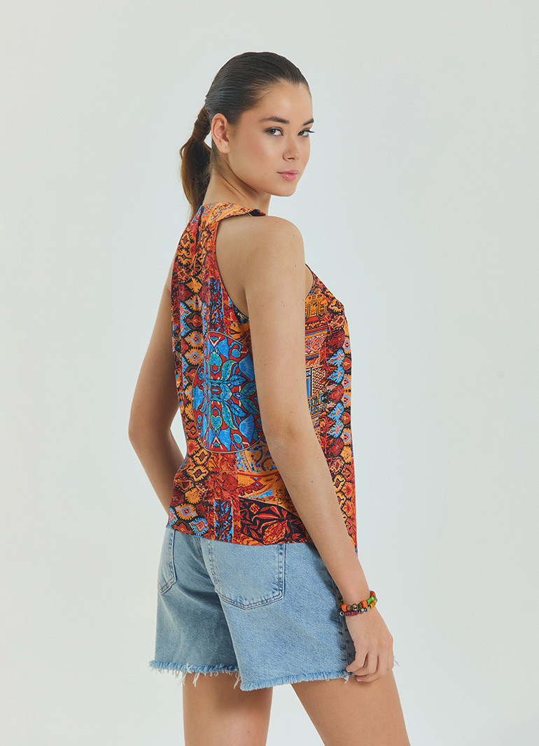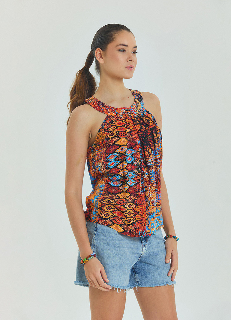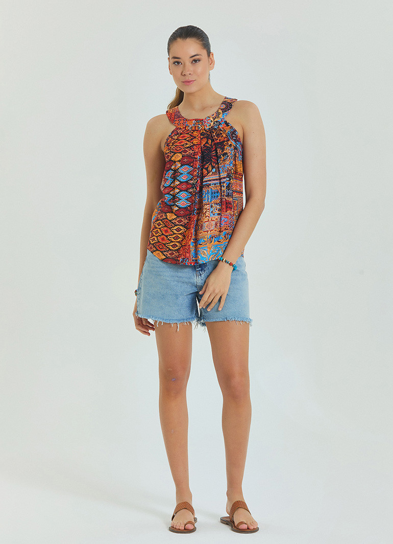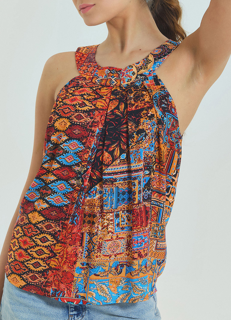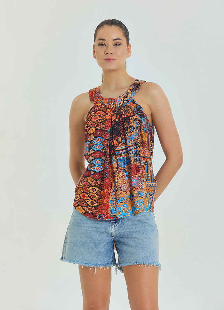 Bohem ve etnik tarzın modern şıklıkla buluştuğu Halter Yaka Düğme Detaylı Pileli Turuncu Otantik Bluz 6993, yaz mevsimine enerjik ve özgün bir dokunuş katmak isteyen kadınlar için tasarlandı. Canlı turuncu rengi ve etnik desenleriyle fark yaratan bu model, sıcak havalarda konforu ve tarzı bir arada sunuyor.