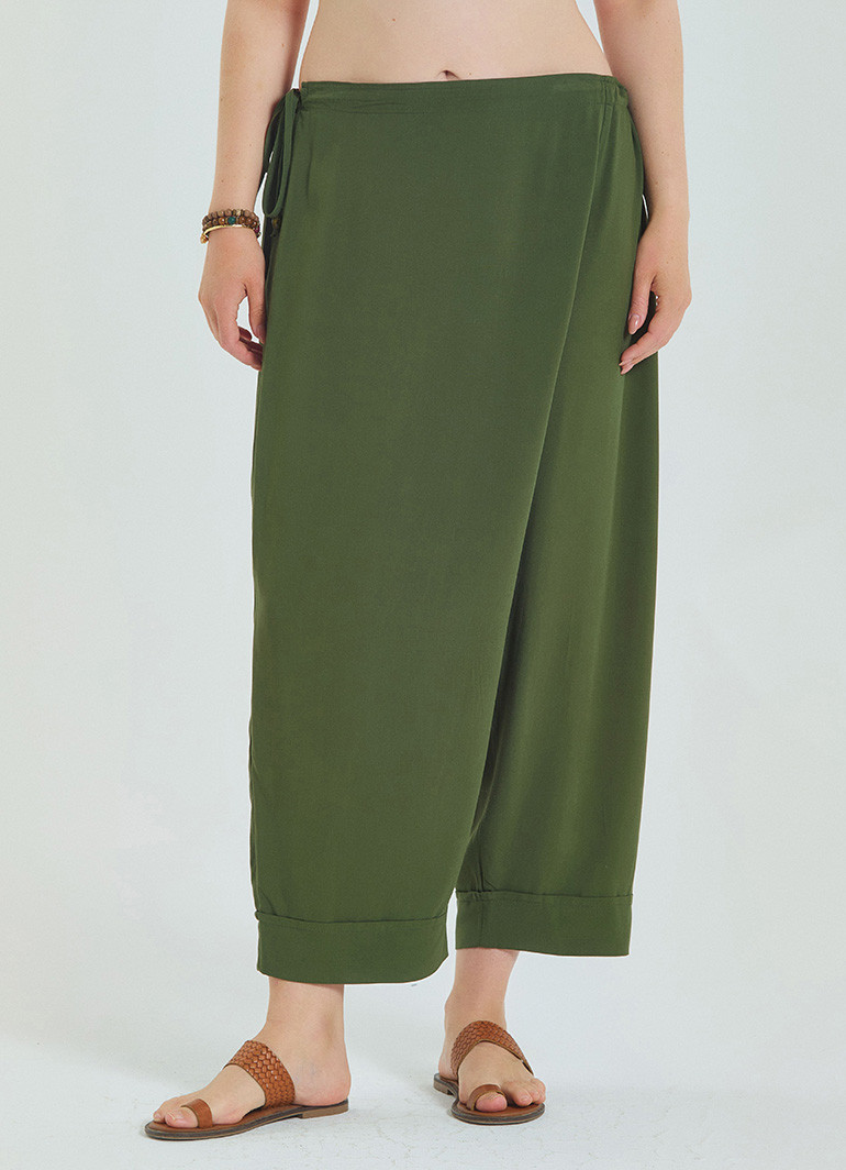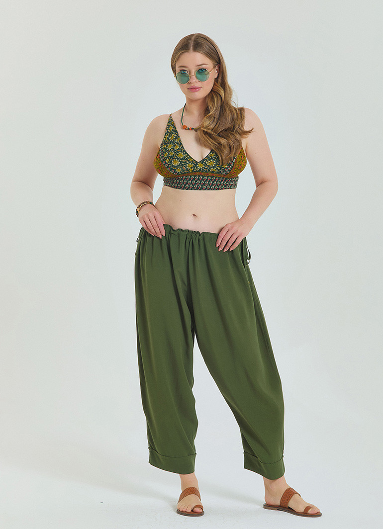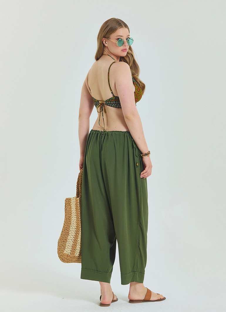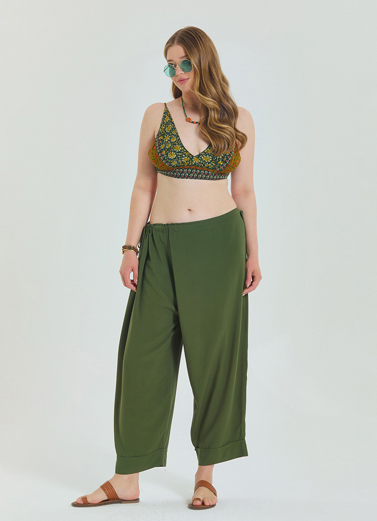 Yaz aylarında stilinizden ödün vermeden konfor arıyorsanız, bu haki büyük beden pantolon tam size göre. Beli ayarlanabilir yapısı ve zarif ip detayları ile öne çıkan bu tasarım, şıklığı fonksiyonellikle buluşturuyor.