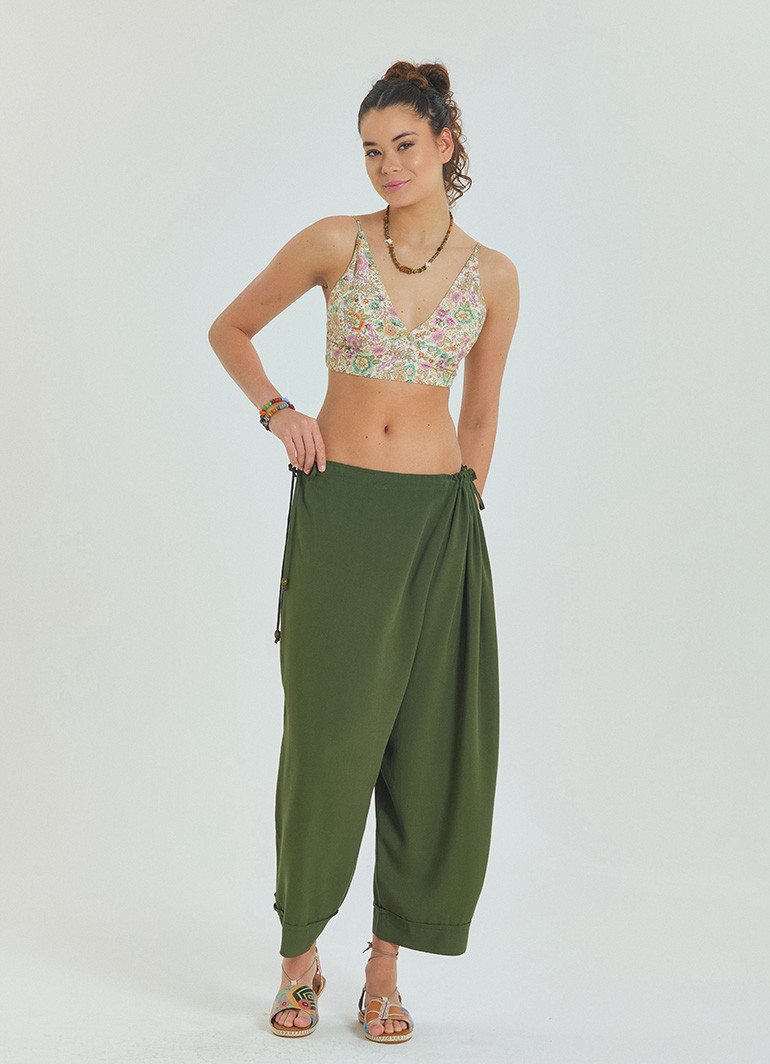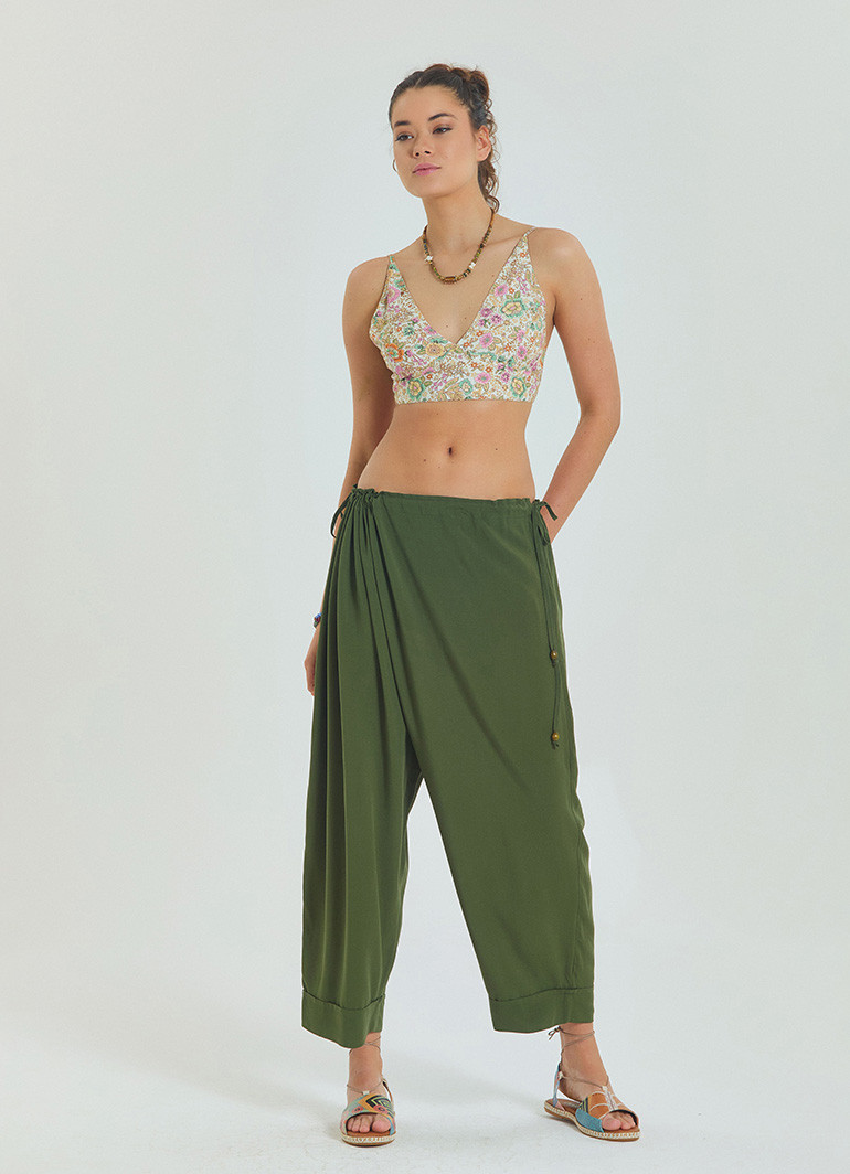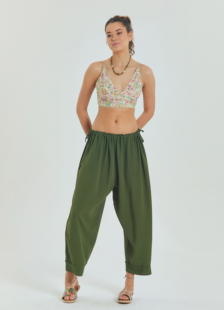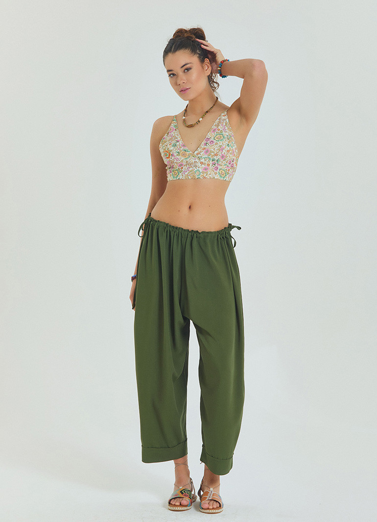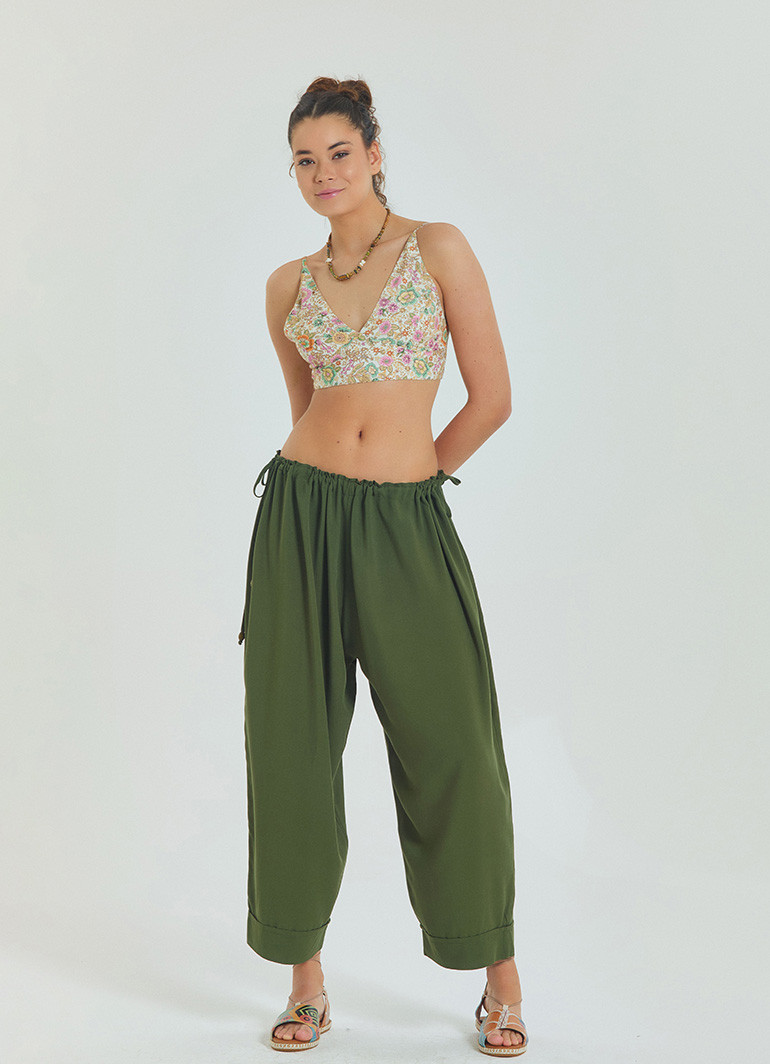 Bu şık ve rahat yeşil pantolon, yazın sıcak günlerinde stilinizi tamamlayacak harika bir seçenek. İp detaylı beli ile istediğiniz şekilde ayarlayabilirsiniz, böylece hem rahat hem de şık bir görünüm elde edersiniz.