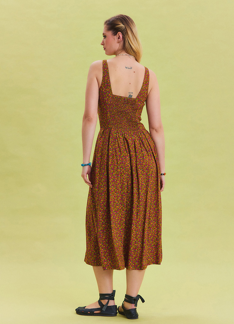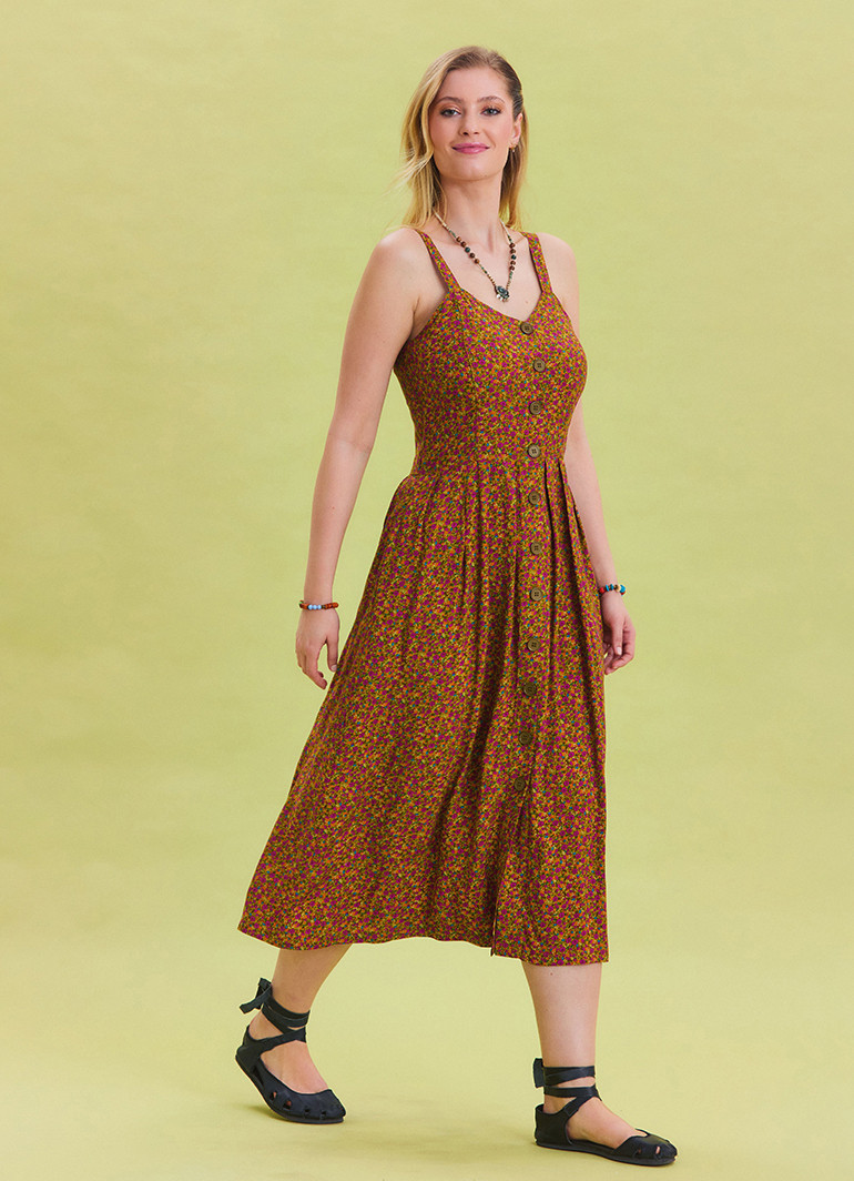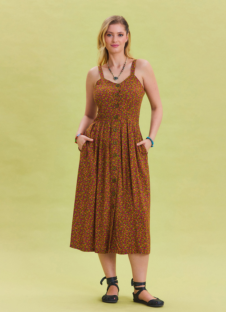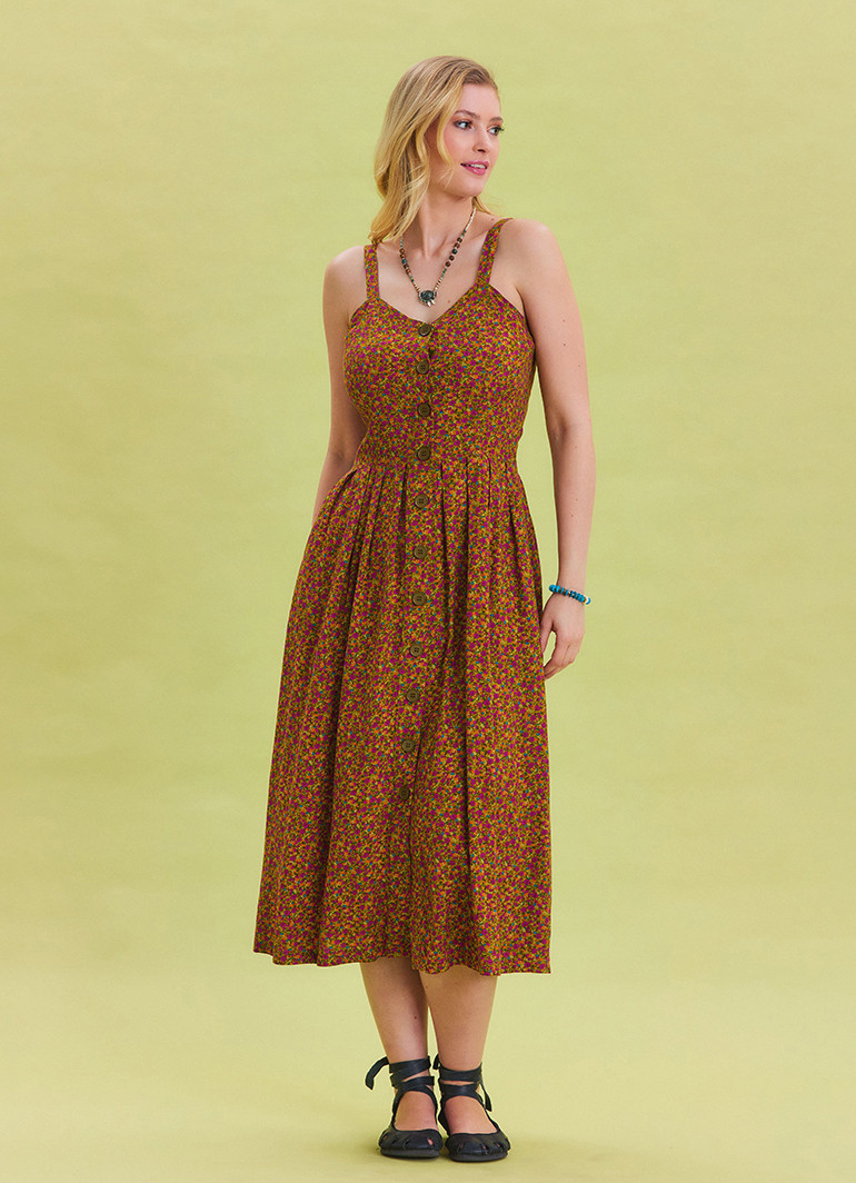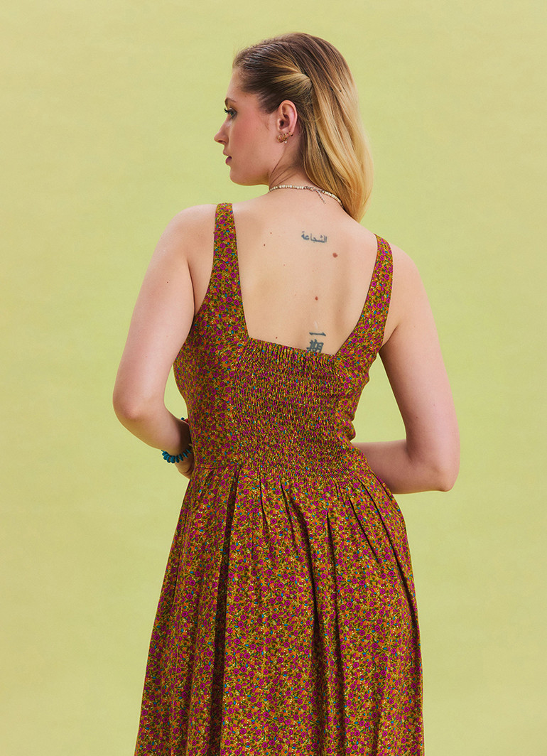 Kalın askıları ve düğme detaylarıyla öne çıkan, yeşil çiçek desenli bu uzun elbise, yaz aylarının vazgeçilmez tercihi olmaya aday.