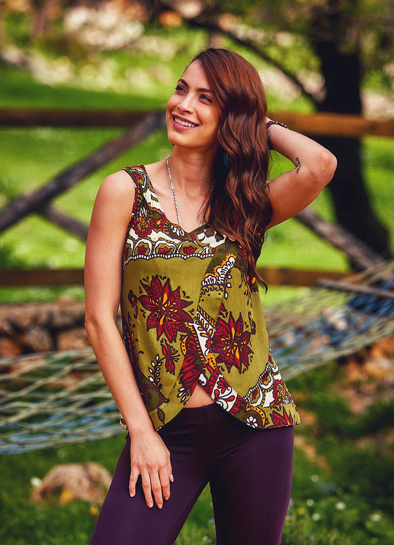 Yeşil çiçekli, kolsuz ve asimetrik kesimi ile bu bluz, bohem tarzını sevenler için ideal bir seçimdir. Düğme detayları ve kayık yaka tasarımı, modern ve şık bir hava katarken, hafif viskon kumaşı cildinizin nefes almasını sağlar.