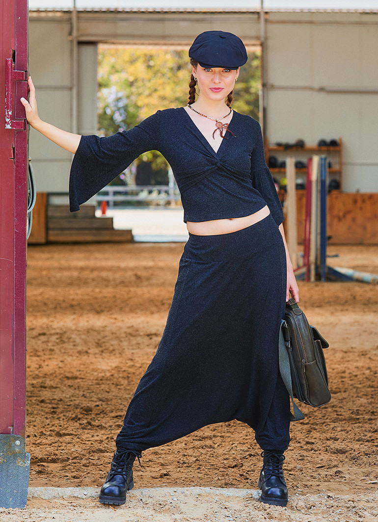 Paçası lastikli, düşük ağı ve salaş kesimiyle öne çıkan bu siyah kadın pantolon, hem şıklığı hem de rahatlığı bir arada sunar. Bohem tarzıyla günlük ve özel kombinlerin vazgeçilmezi olacak.