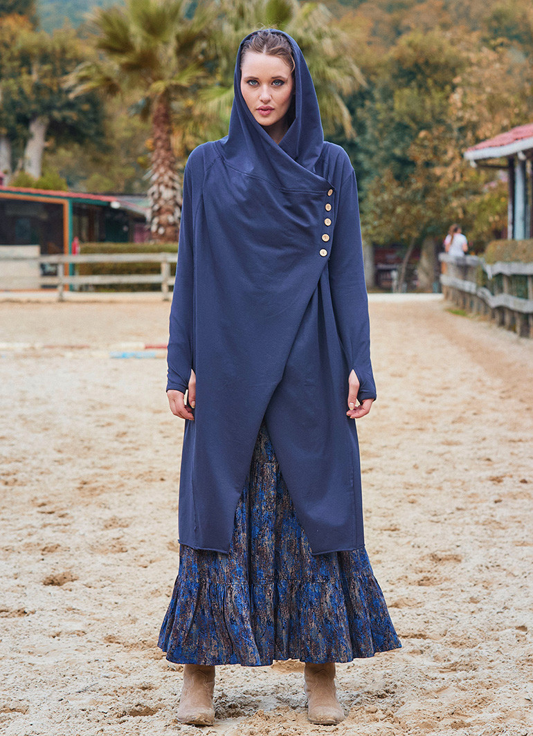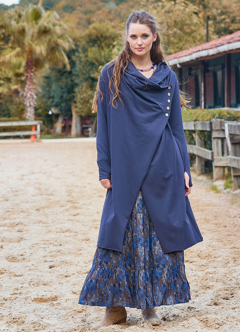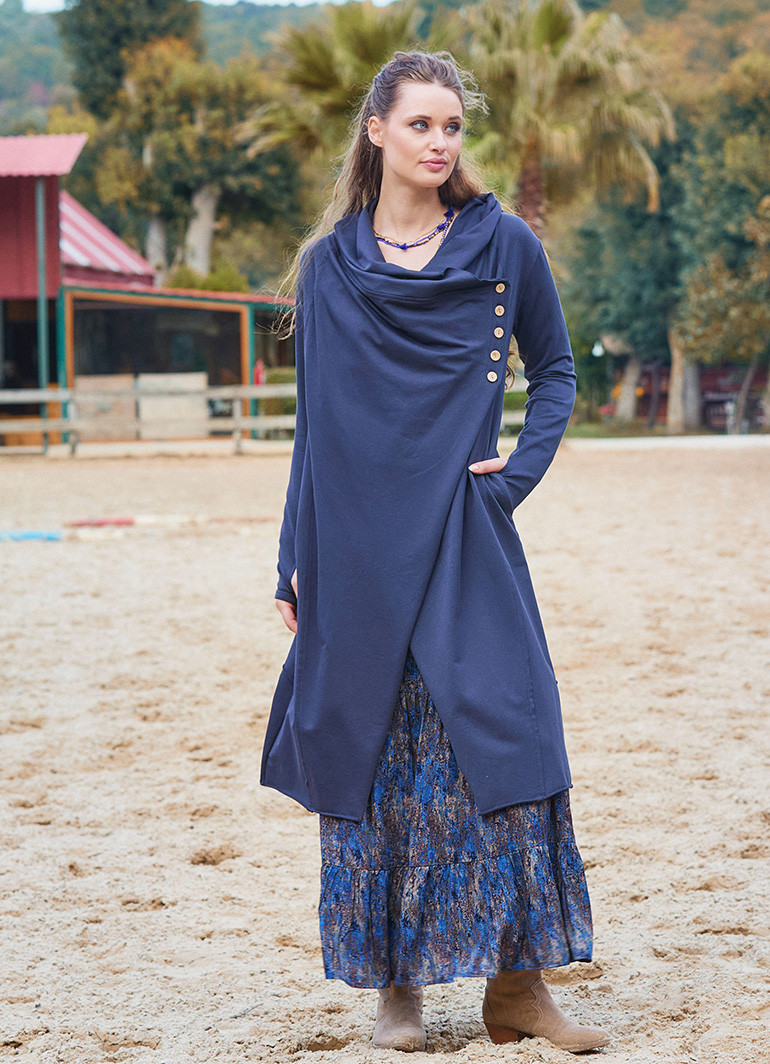 Parmak geçmeli düğme detayları ve dökümlü kapüşon tasarımıyla öne çıkan bu antrasit bohem hırka, kış sezonunda şıklığı ve rahatlığı bir arada sunuyor. Günlük kombinlerinize özgün bir dokunuş katarken, modern ve bohem tarzınızı da vurgulamanızı sağlar.