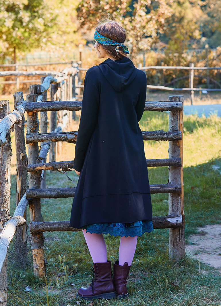 Parmak geçmeli düğme detayları ve dökümlü kapşon tasarımıyla öne çıkan siyah bohem hırka, şıklığı ve konforu bir araya getiriyor. Günlük kombinlerinize modern bir dokunuş katarken, bohem tarzı ile özgün bir stil sunar.