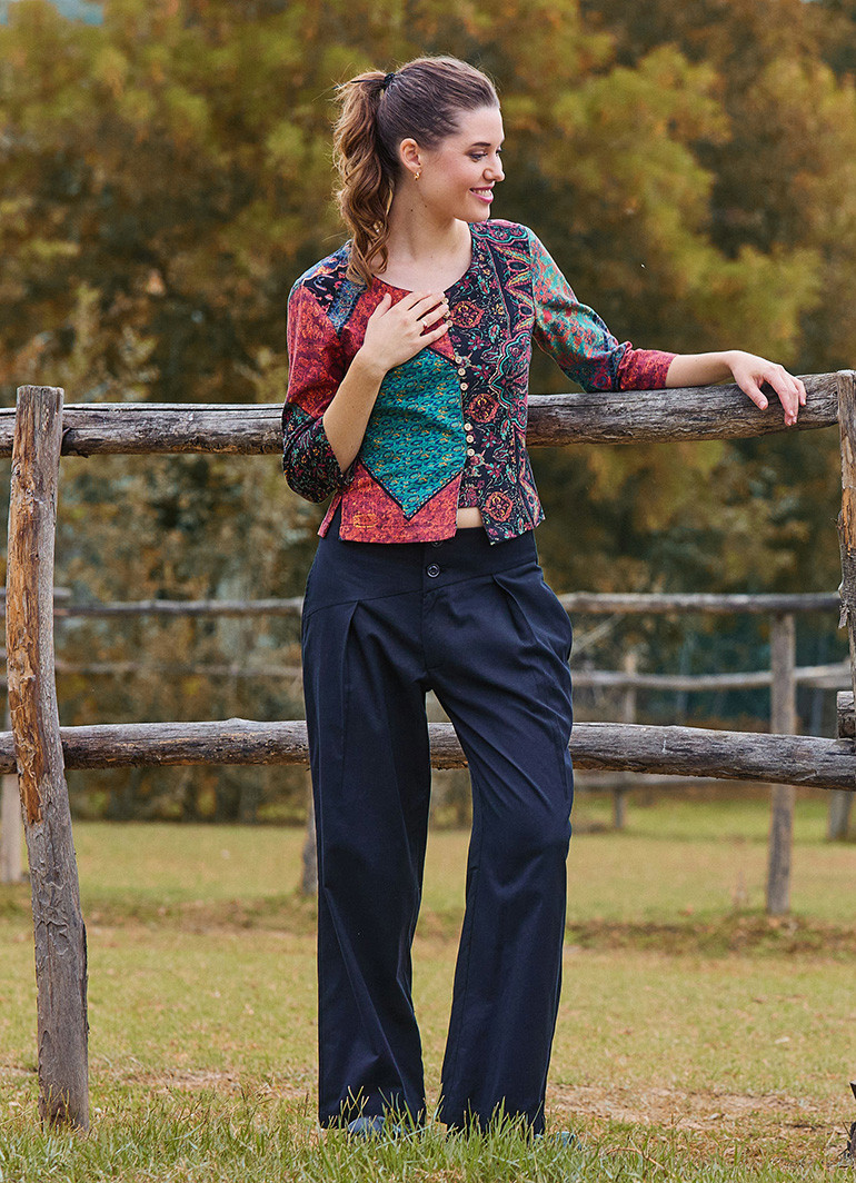 Pileli verev kesim düğmeli siyah bohem pantolon, modern ve zarif tasarımıyla öne çıkıyor.