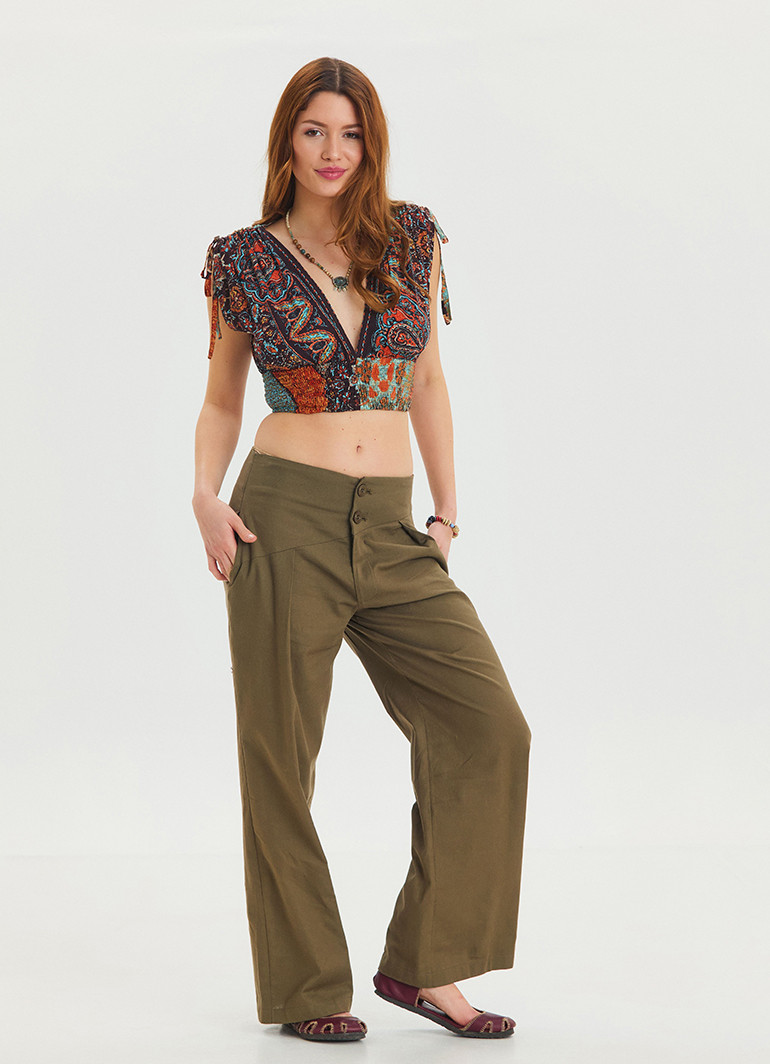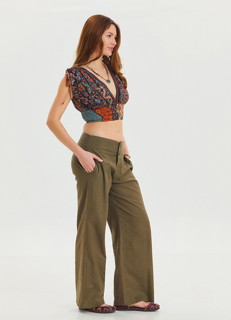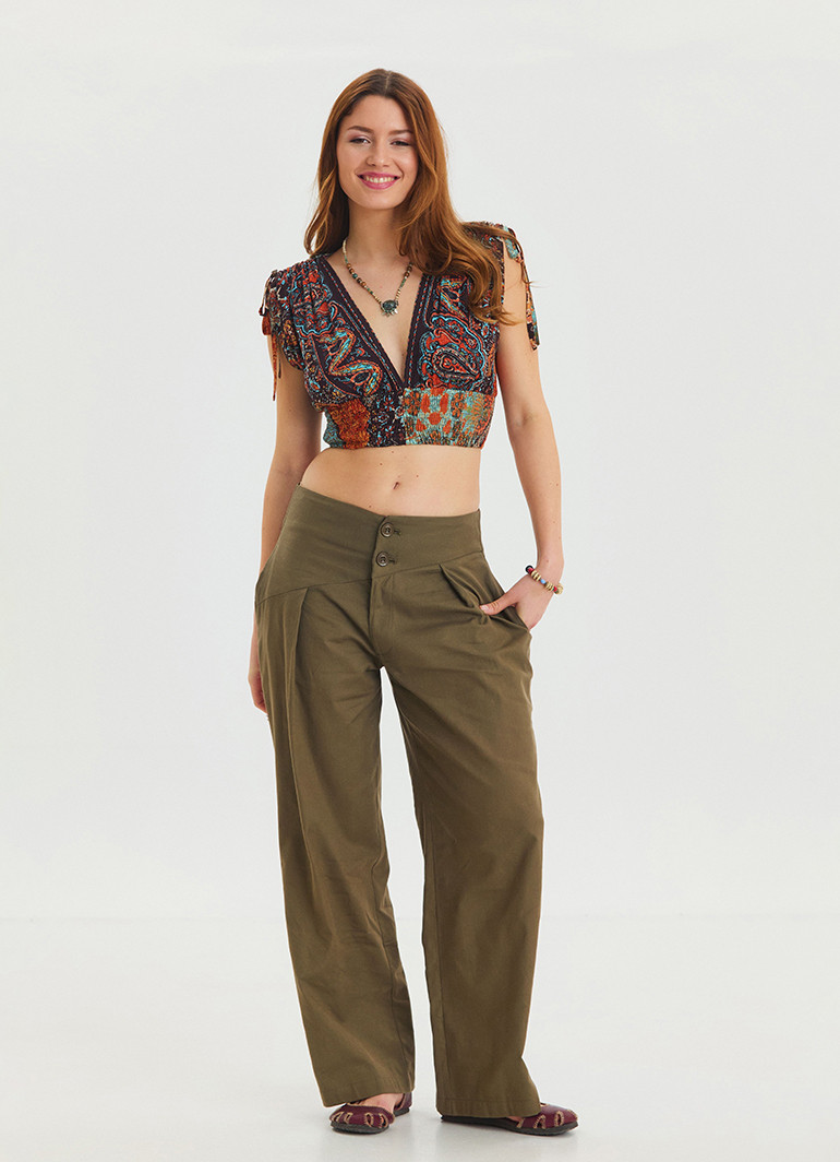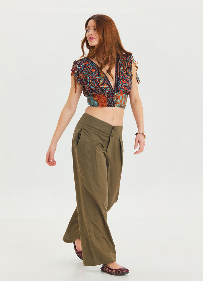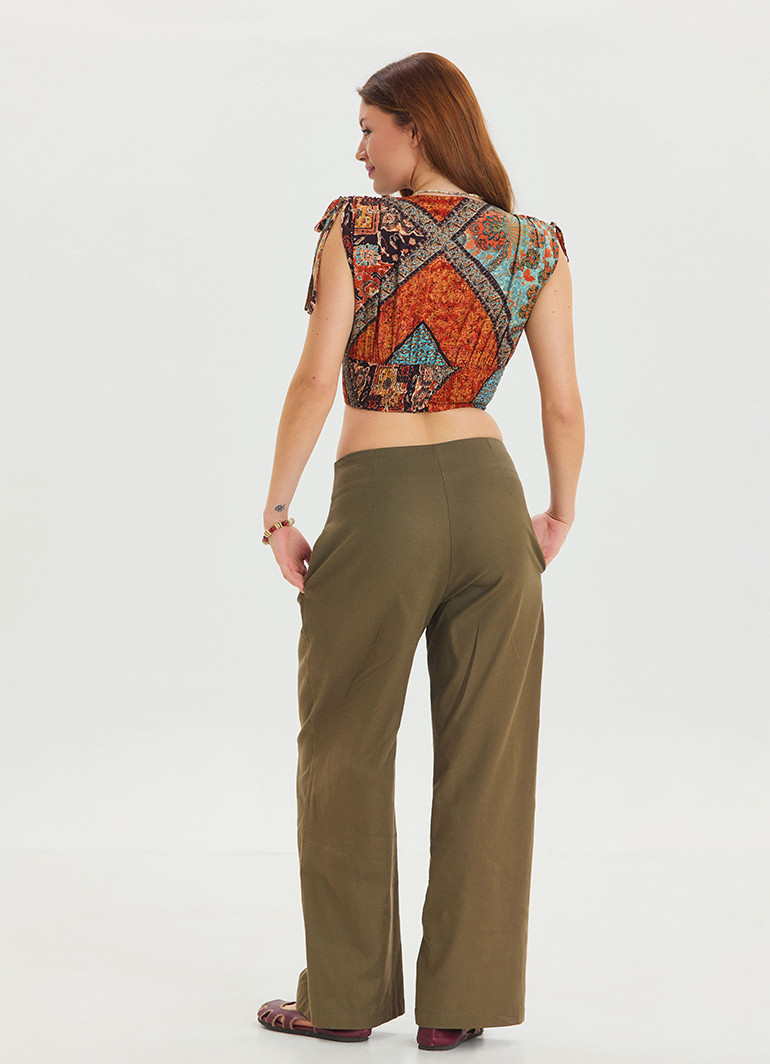 İp Detaylı Düğme Beli Lastikli Haki Bohem Şalvar 6875