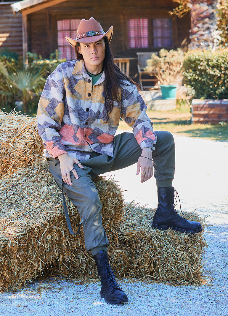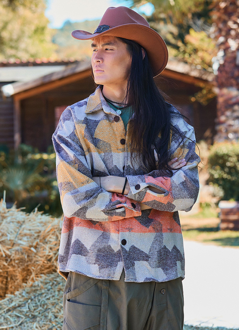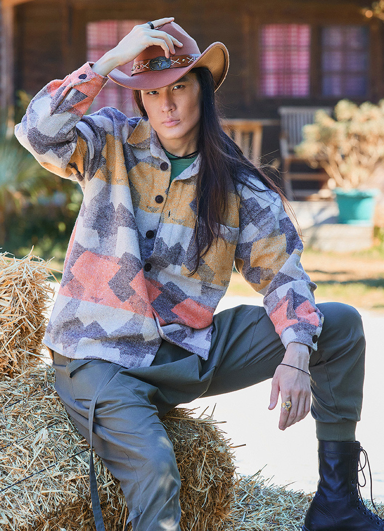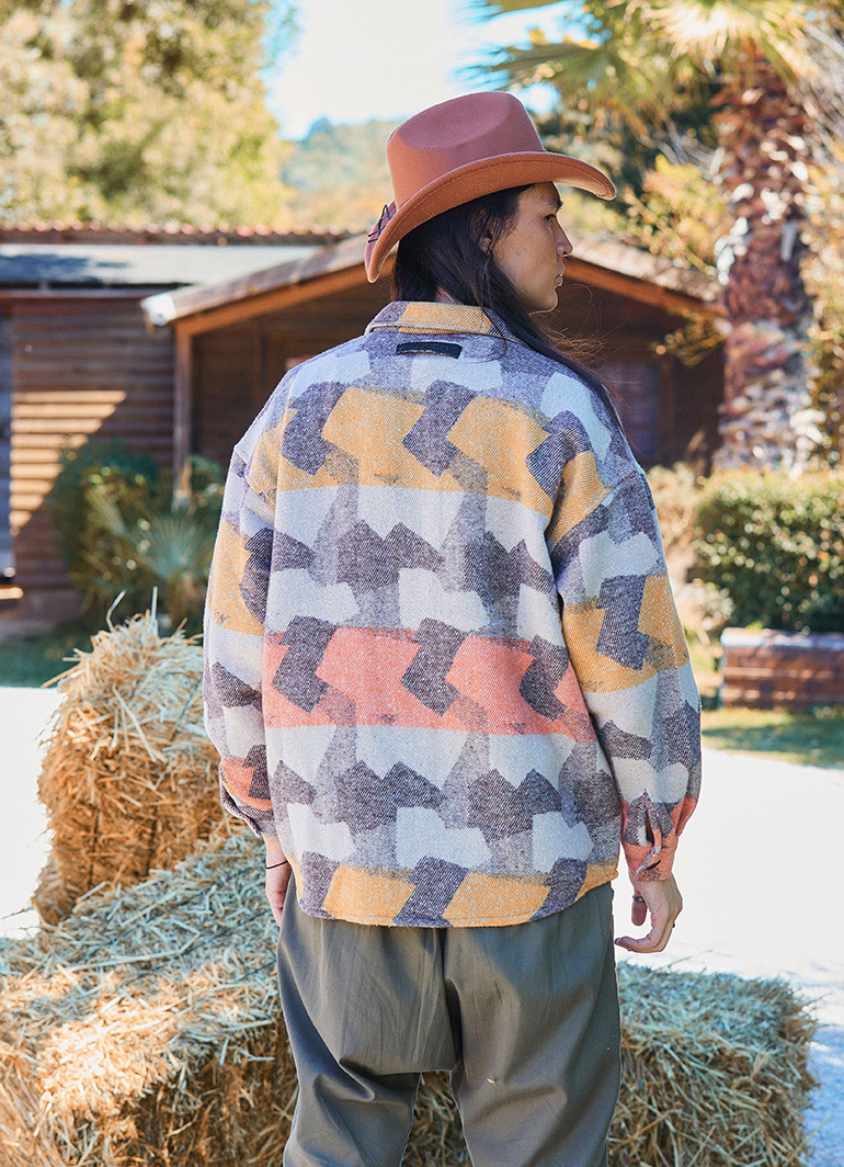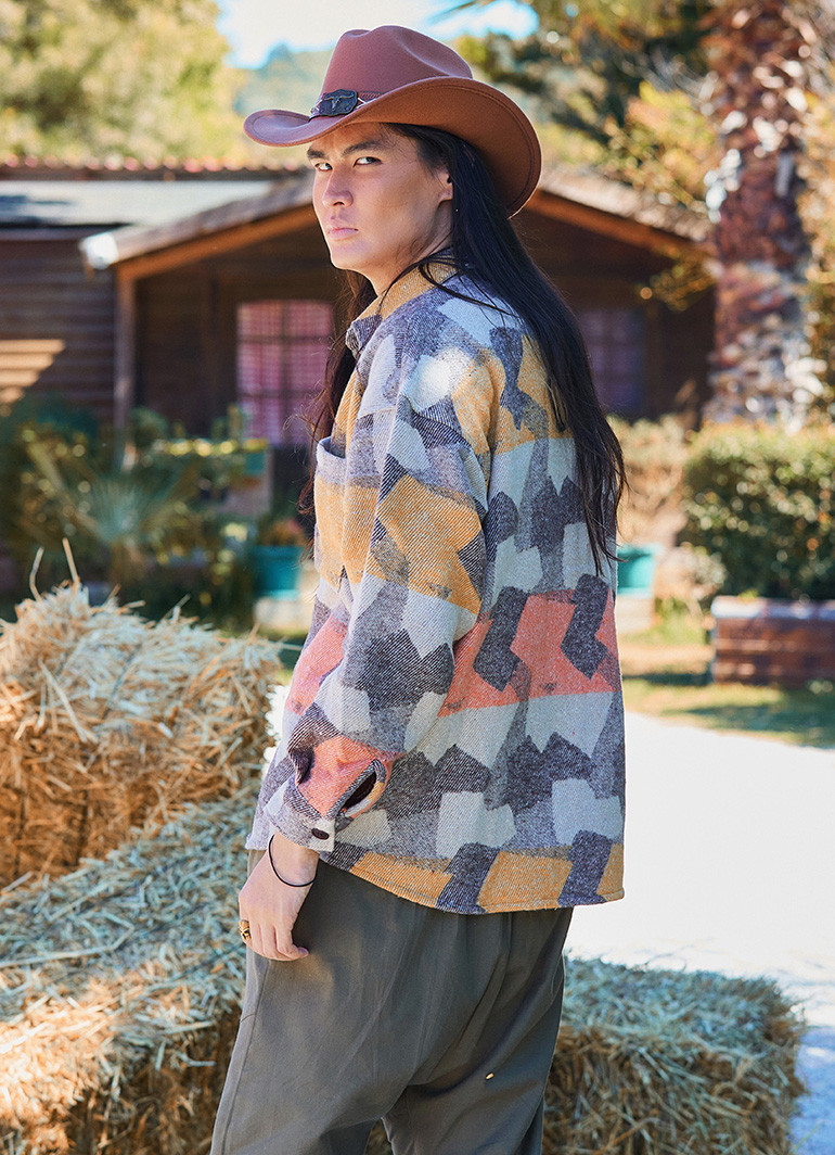 Canlı turuncu tonlardaki etnik desen, sade parçalarla kombinlendiğinde dikkat çekici bir odak noktası oluşturur — kot pantolon, chino veya hafif keten pantolonlarla uyum sağlar. Uzun kollu yapısı, serin günlerde omuzları ve kolları rahatça örterken katmanlı giyime de uygundur.