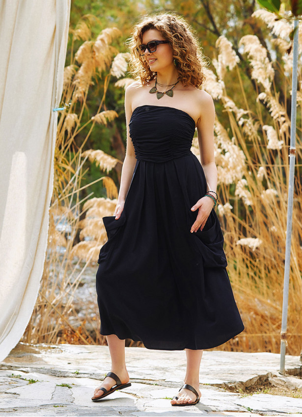 Straplez Göğüs Cep Detaylı Siyah Kloş Elbise 6778, modern kadının şıklığını ve zarafetini ön plana çıkaran bir tasarıma sahiptir. İnce detayları ve özgün kesimi sayesinde her ortamda fark yaratır.
