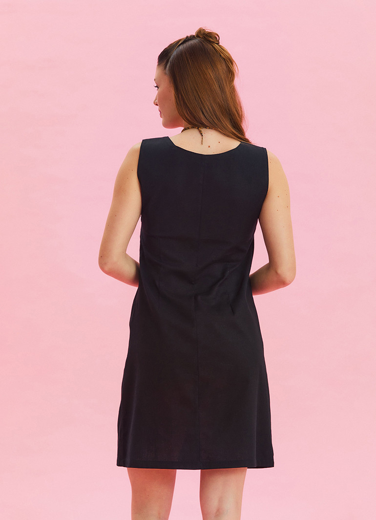 Türkiye’de üretilen bu mini elbise, modern kesimi ve u yaka detayı ile şıklığı tamamlar. Düğme detayları, elbiseye hareket katarken, özgün kedi figürü fark yaratır.