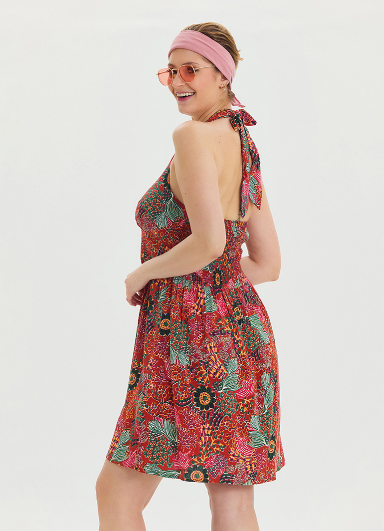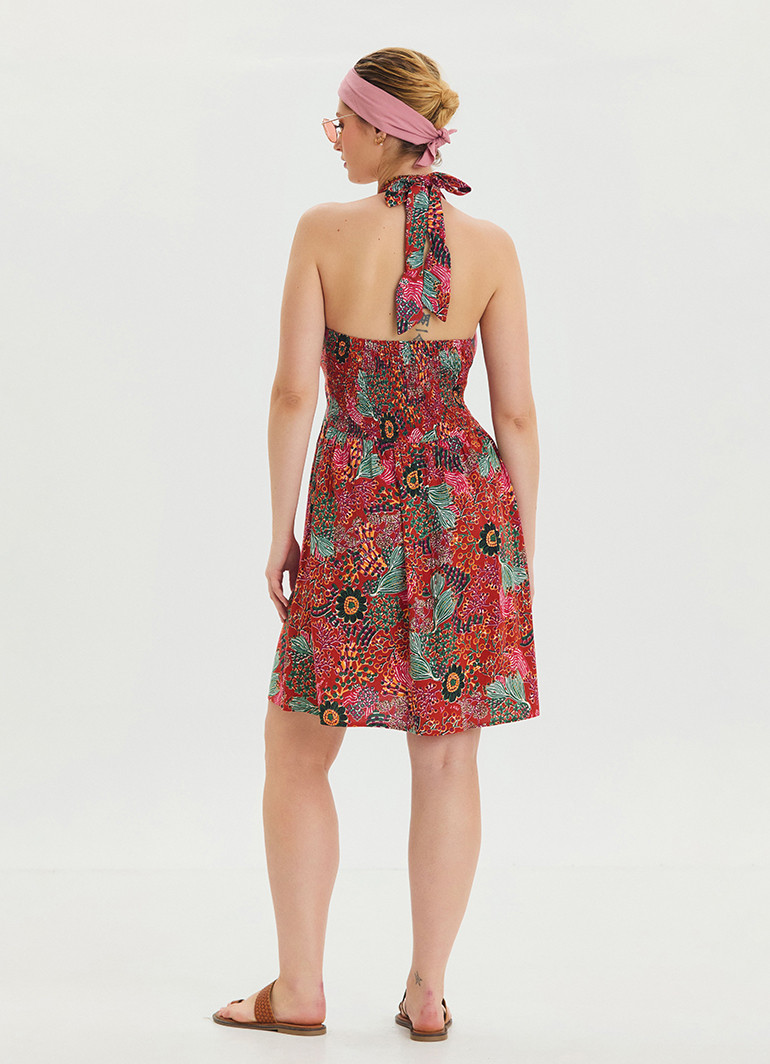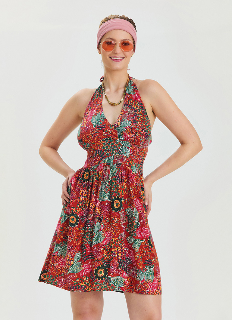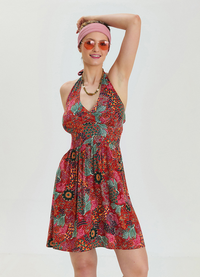 V Yaka Boyundan Bağlamalı Kırmızı Çiçekli Elbise 6863, zarif detayları ve modern kesimiyle öne çıkıyor. Gipeli açık sırt detayı ve anvelop yaka, elbisenize eşsiz bir stil kazandırıyor.