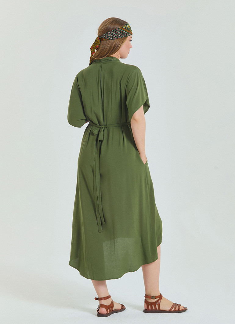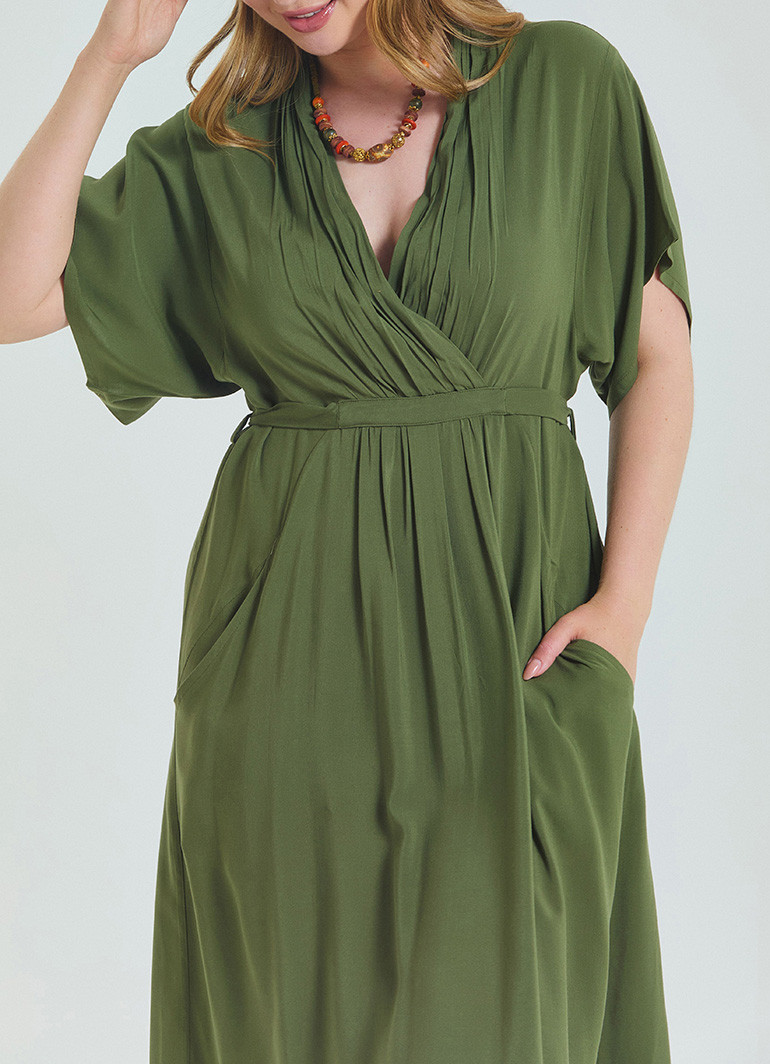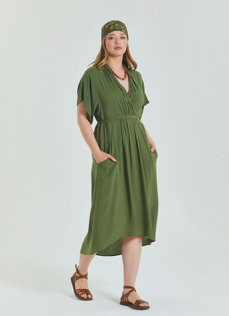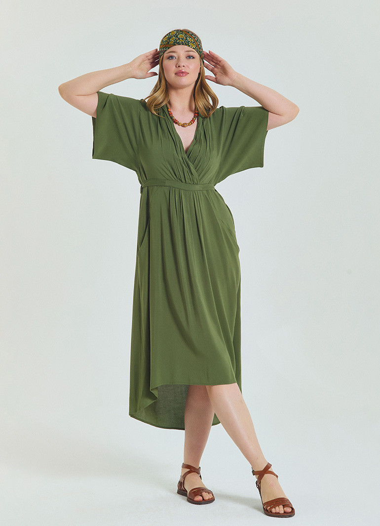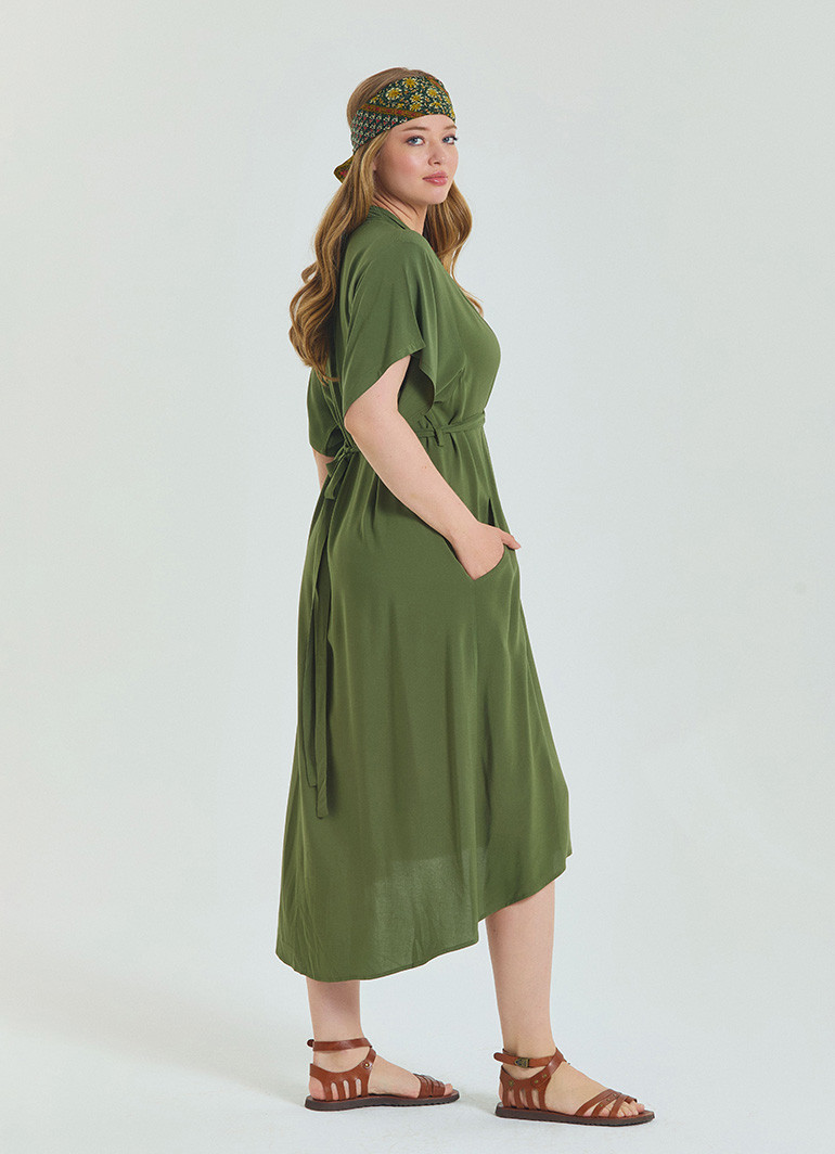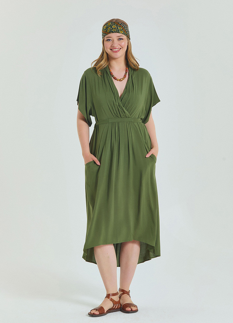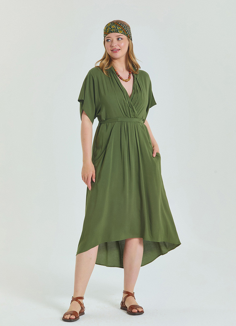 Konforu ve şıklığı bir araya getiren V Yaka Büzgü Detaylı Haki Büyük Beden Elbise 6943, yaz mevsiminin favorisi olmaya aday! Ferah dokusu ve sade tasarımıyla dikkat çeken bu elbise, büyük beden kadınların hem şık hem de rahat hissetmesini sağlıyor.