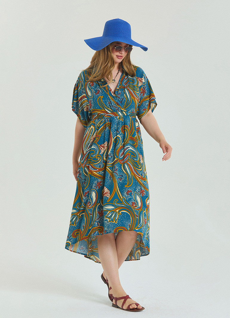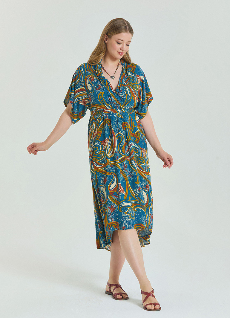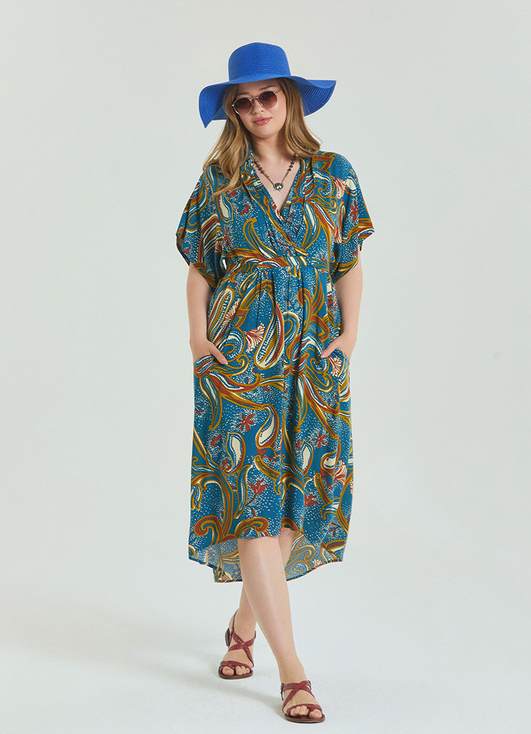 Zarafet ve konforu bir arada sunan V Yaka Büzgü Detaylı Petrol Büyük Beden Elbise, yaz günlerinde ferah bir şıklık arayan kadınlar için tasarlandı.