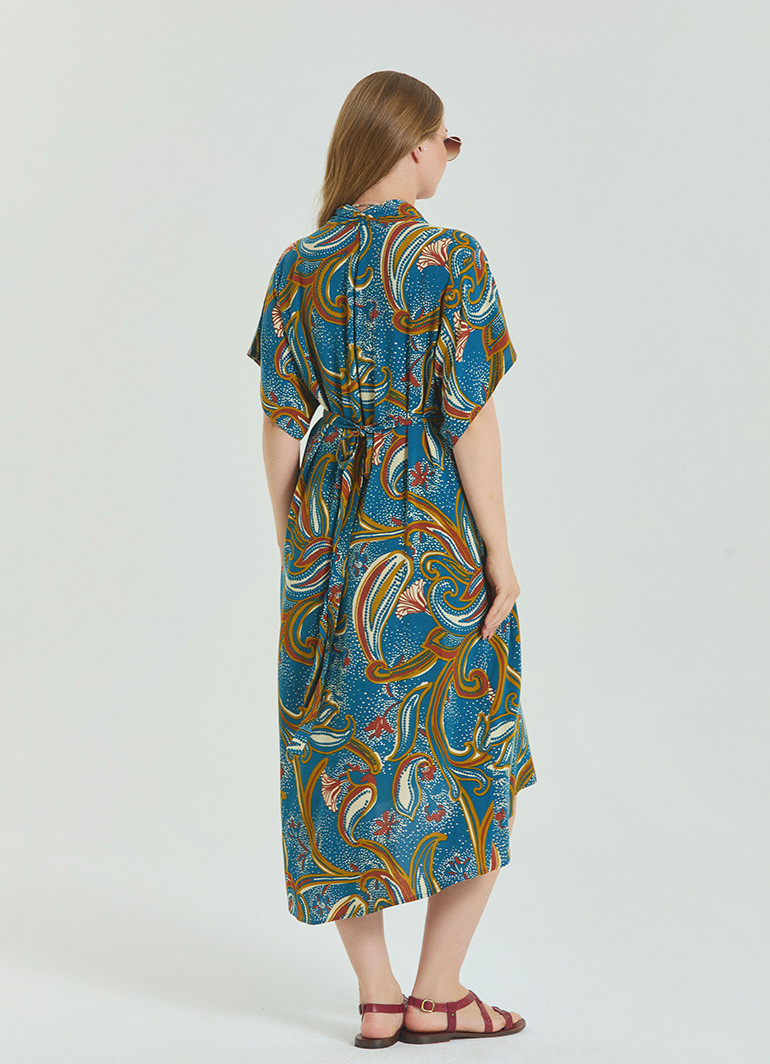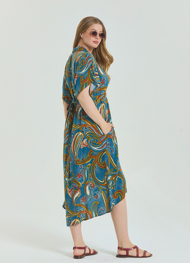 %100 dokuma viskon kumaştan üretilen bu elbise, nefes alabilir yapısı sayesinde sıcak havalarda terletmez ve doğal bir serinlik sunar. Polyester içermediği için cilde dosttur.