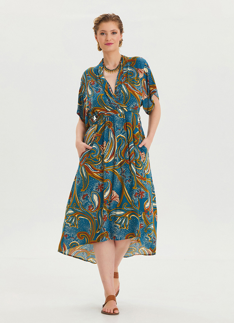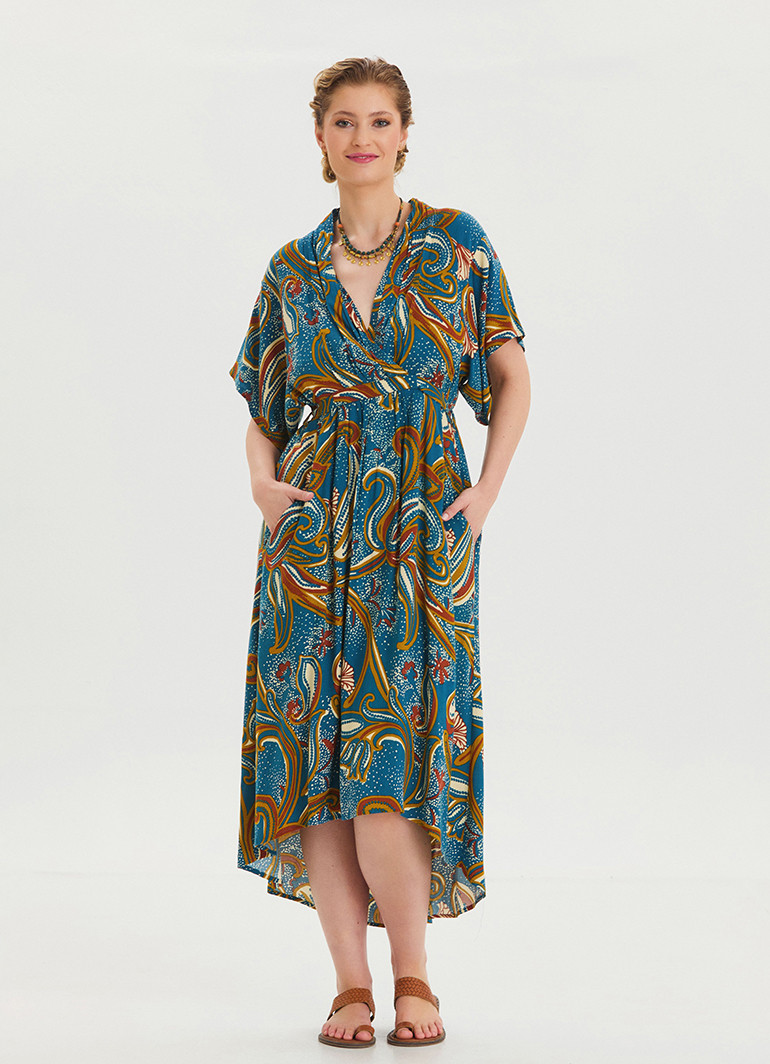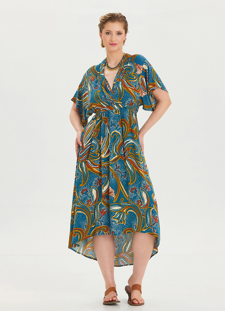 Petrol çiçekli desen, özgün ve çekici bir görünüm sağlarken, V yaka detayı boyun hattınızı öne çıkarır. Her detayında kalite ve estetiğin birleştiği bu model, modern kadınların vazgeçilmezi olacak.