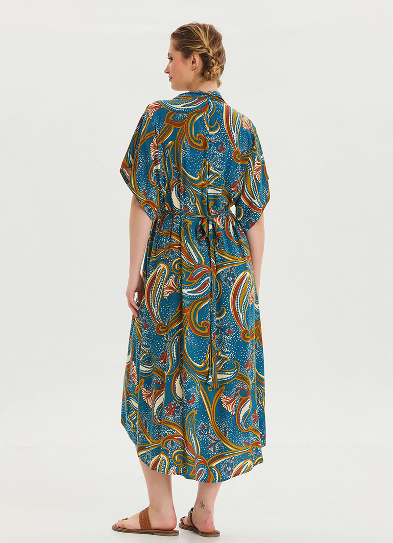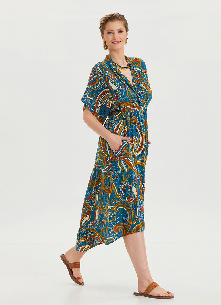 %100 dokuma viskon kumaşı, polyester içermediği için nefes alır ve sizi terletmez. Yarı kollu yapısı ve beli lastikli detayı, vücudunuzu nazikçe sarar, zarif bir silüet oluşturur.