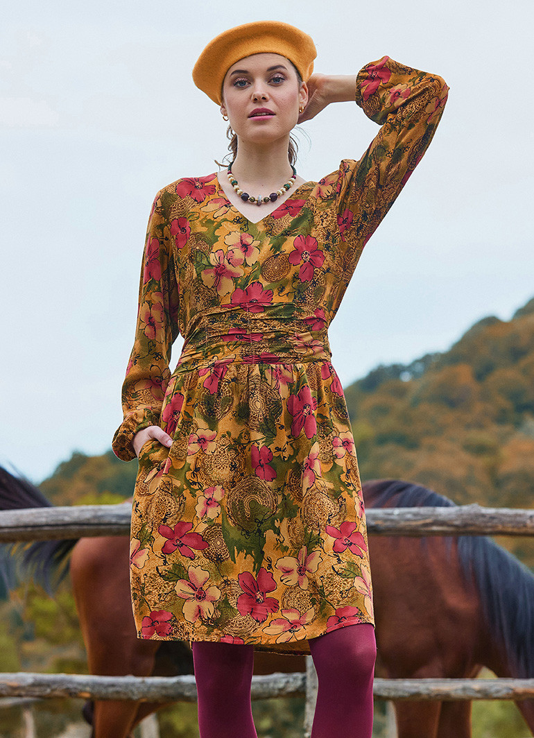 V yaka drapeli kuşak detaylı bej çiçekli elbise, zarif görünümüyle günlük kombinlerden özel davetlere kadar her ortamda şıklığınızı ön plana çıkarır. Drapeli tasarımı ve kuşak detayı vücut hatlarını dengeli bir şekilde öne çıkarırken, modern ve feminen bir siluet sunar.
