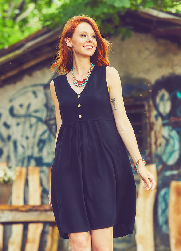 Yazın sıcak günlerinde hem rahat hem de şık olmak isteyenler için ideal bir seçenek: V Yaka Düğme Detaylı Kolsuz Siyah Yazlık Elbise 6896. Şıklığınızı tamamlayacak bu elbise, modern tasarımı ve kaliteli kumaşıyla dikkat çekiyor.