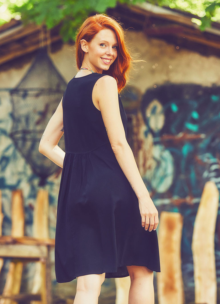V yaka ve kalın askılarıyla, yaz sıcaklarına uygun hafif bir kesime sahip. Düğme detayları ise elbiseye zarif bir dokunuş katıyor. Kloş etek ucu, hareket özgürlüğü sağlarken, vücuda oturan kesimi ile zarif bir siluet oluşturur.