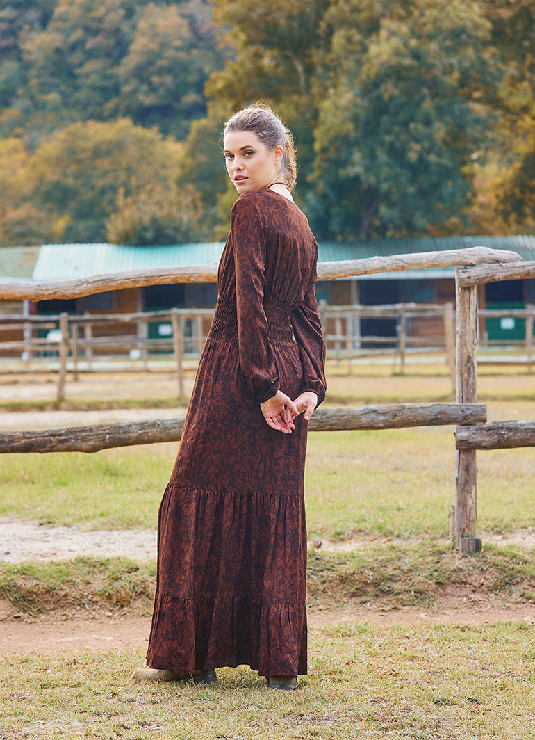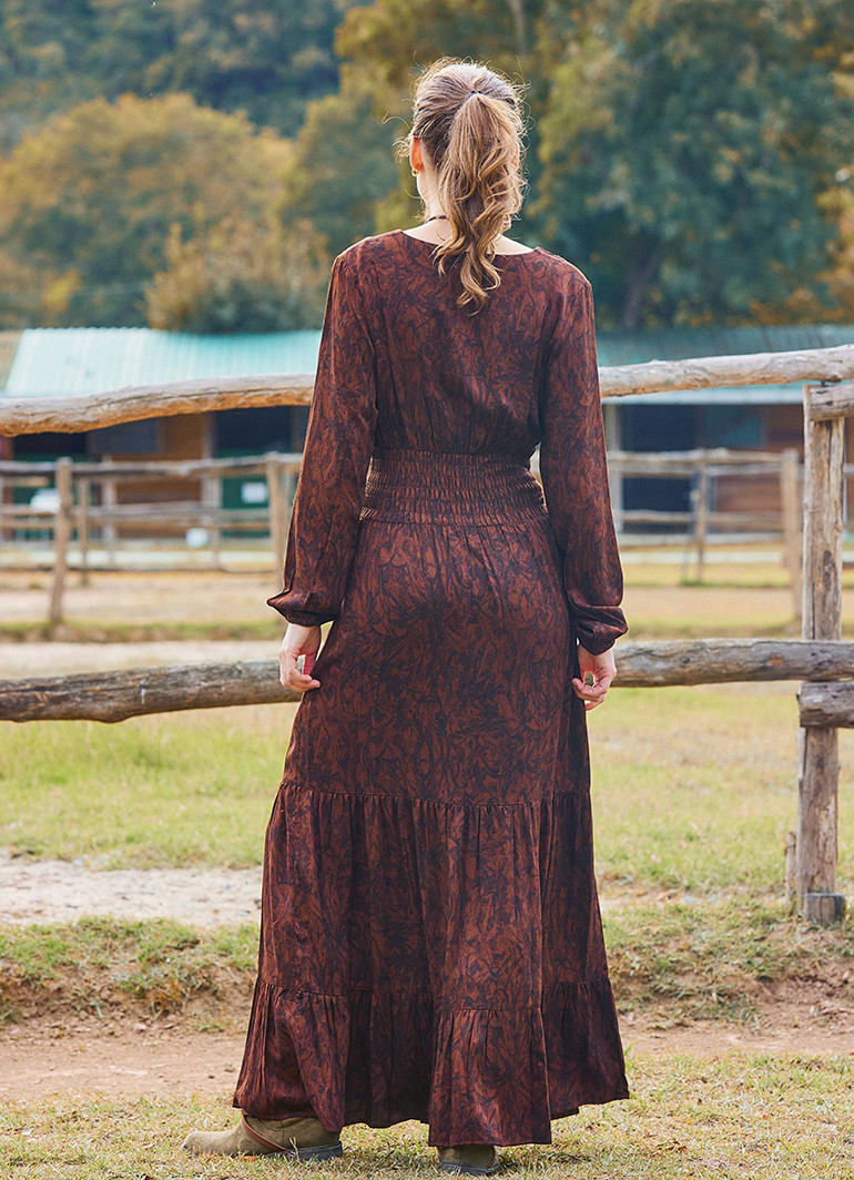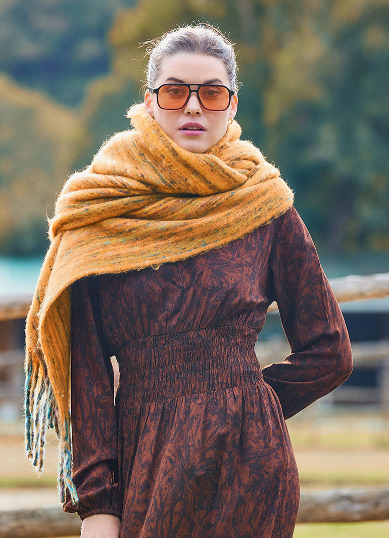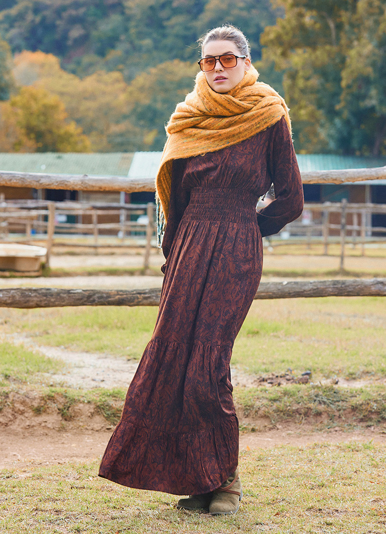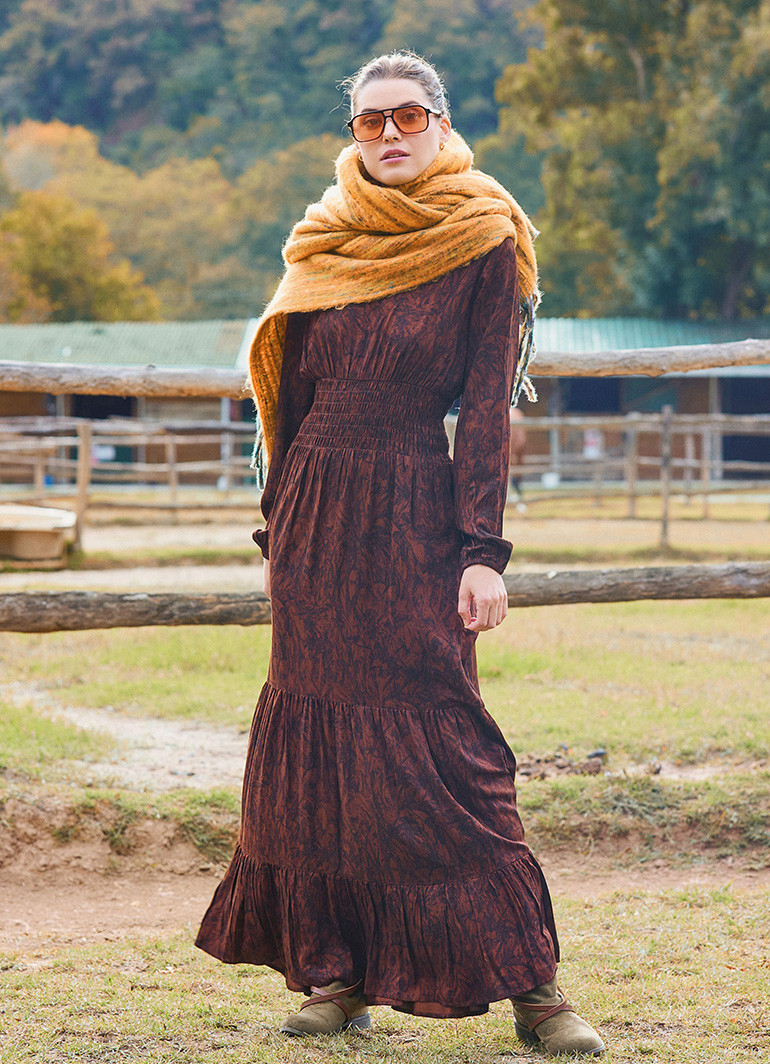 %100 viskon kumaştan üretilen elbise, doğal selüloz yapısı sayesinde nefes alır, hafifliğiyle üzerinizde yokmuş hissi uyandırır. Polyester içermeyen yapısı cildinizi tahriş etmez ve terletmez. Kahverenginin sıcak tonlarıyla kış kombinlerinize sofistike bir dokunuş katar.