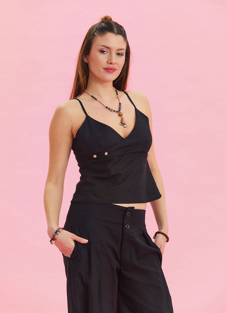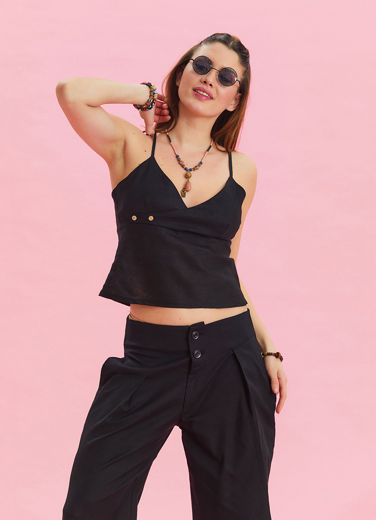 İnce askıları ve özenle yerleştirilmiş düğme detayları, bluza özgün bir karakter kazandırırken, %100 dokuma pamuk kumaşı ile cildinize dost bir deneyim sunuyor. Kolay bakımı ve dayanıklı yapısıyla uzun süreli kullanım imkanı sağlar.