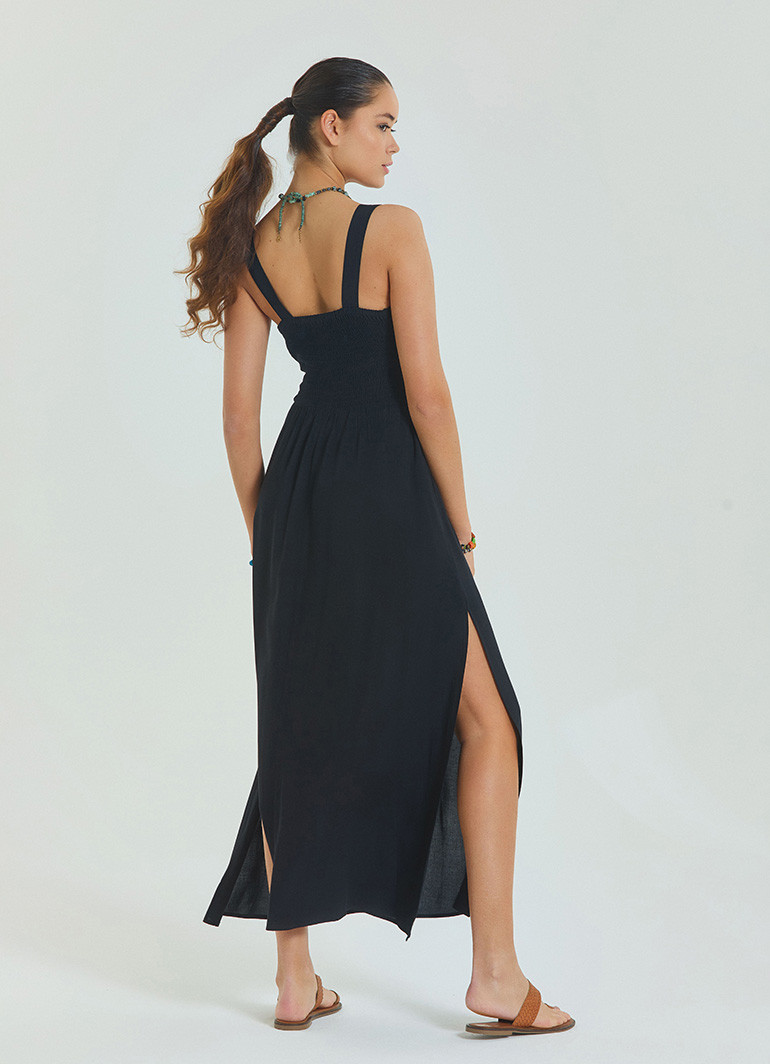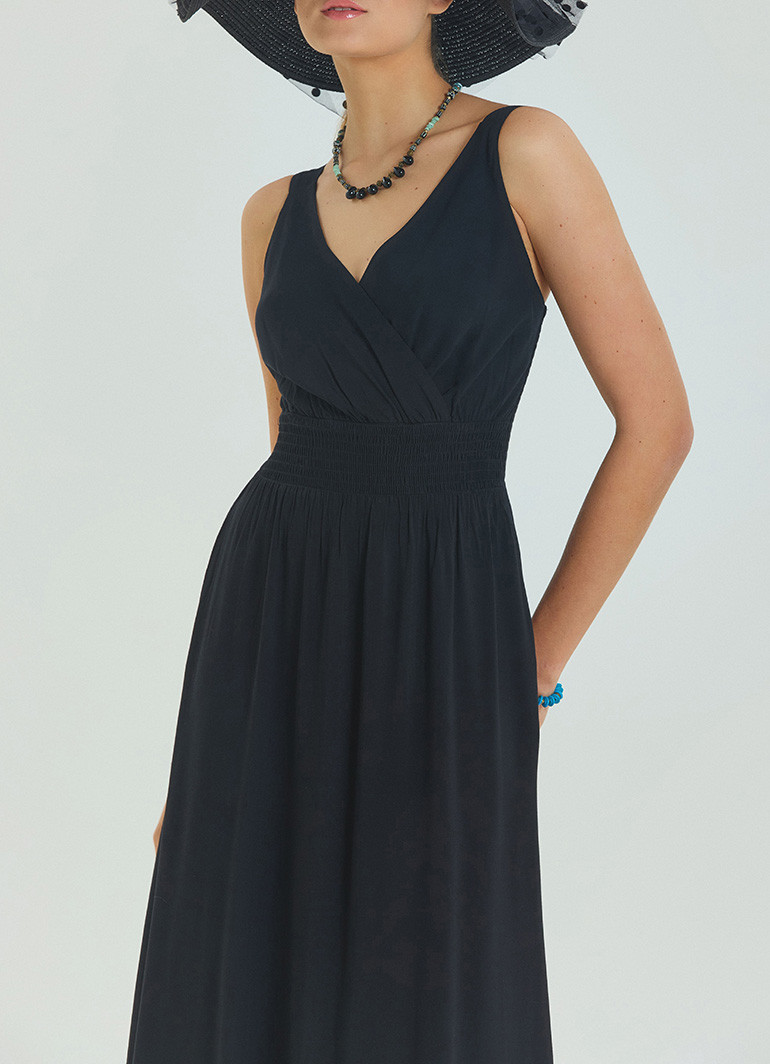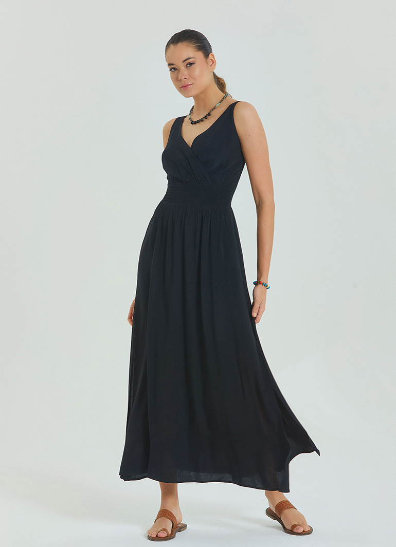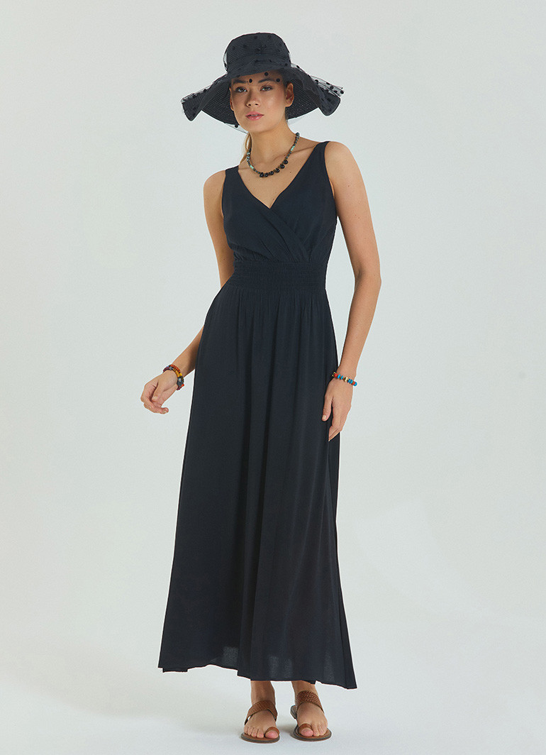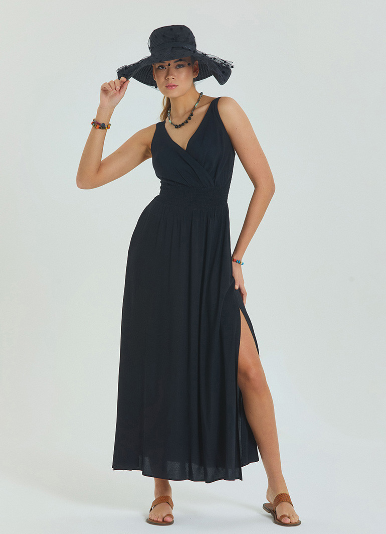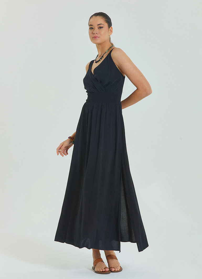 Şıklığı ve zarafeti bir arada sunan V Yaka Robadan Kruvaze Siyah Uzun Elbise 6880, modern kadının gardırobuna eşsiz bir dokunuş katar. V yaka ve kruvaze kesimi, vücut hatlarınızı ön plana çıkarırken, yırtmaç detay sayesinde hareket özgürlüğü sağlar.