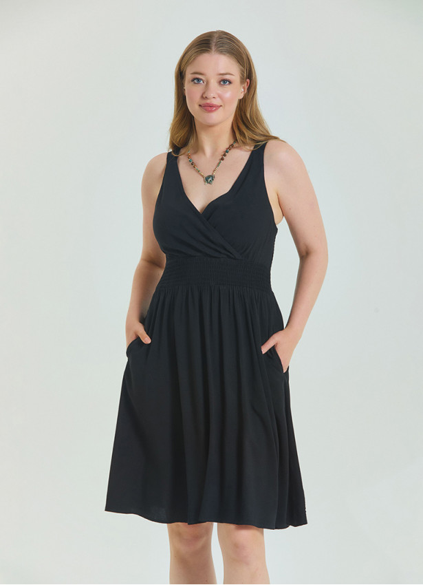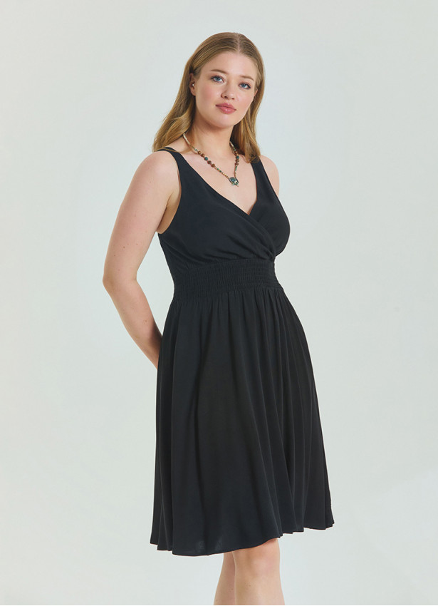 Yaz aylarının vazgeçilmezi V Yaka Robadan Siyah Büyük Beden Elbise; şıklığı ve ferahlığı bir arada sunan doğal viskon kumaşıyla gardırobunuzun yıldızı olmaya aday.