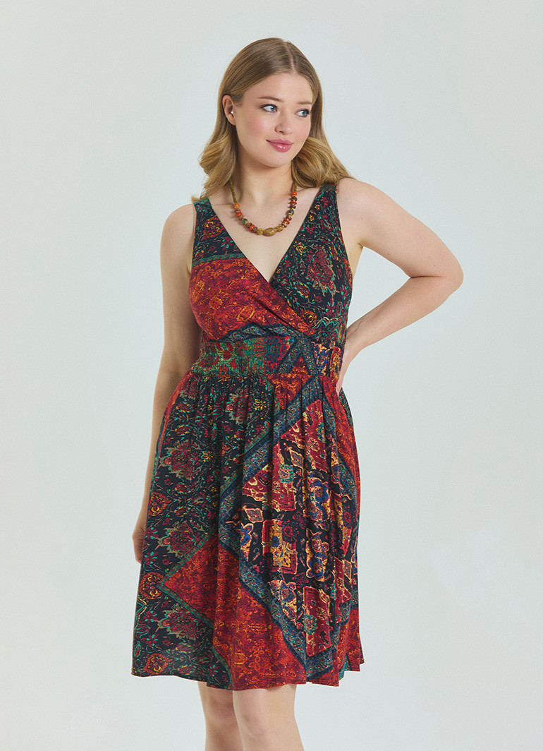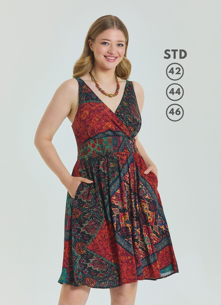 Sıcak yaz günlerinde hem şık hem de konforlu hissetmek isteyenler için tasarlanan V Yaka Robadan Siyah Desenli Büyük Beden Elbise 6905, doğal viskon kumaşıyla serinlik sağlar. V yaka detayı ve robadan kesimiyle zarif bir silüet sunarken, dökümlü yapısıyla hareket özgürlüğü kazandırır.