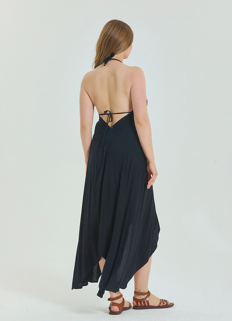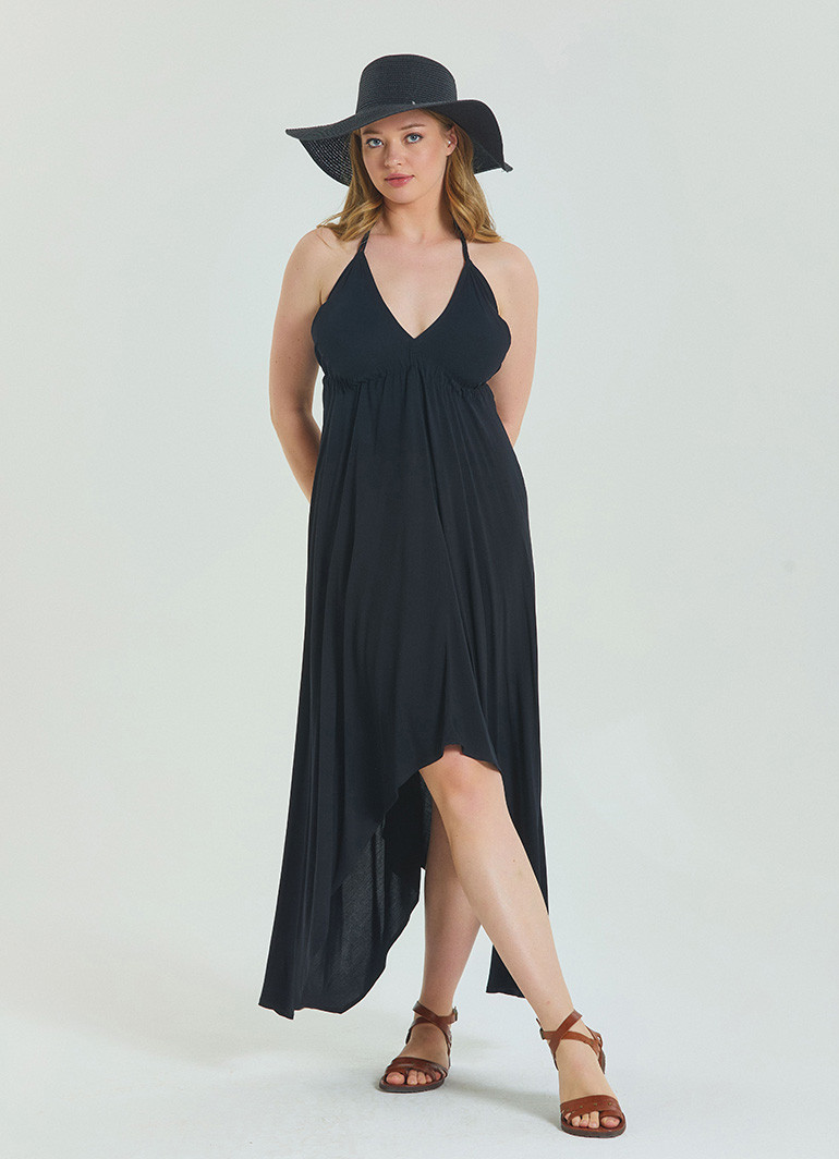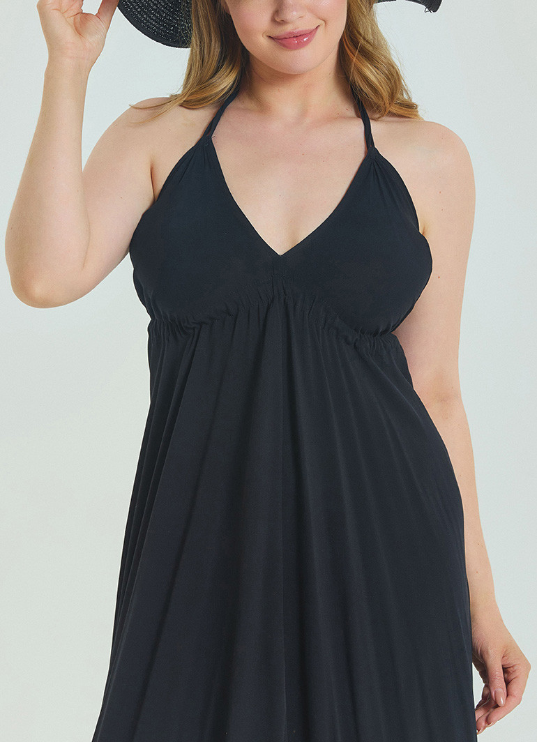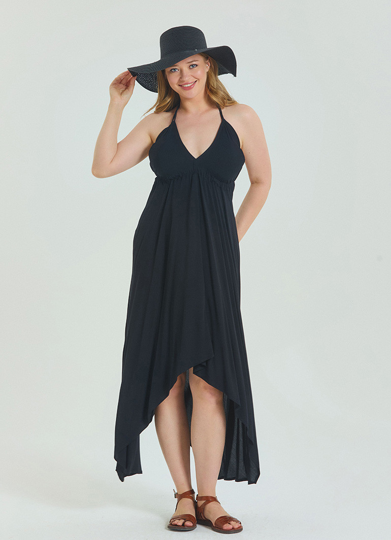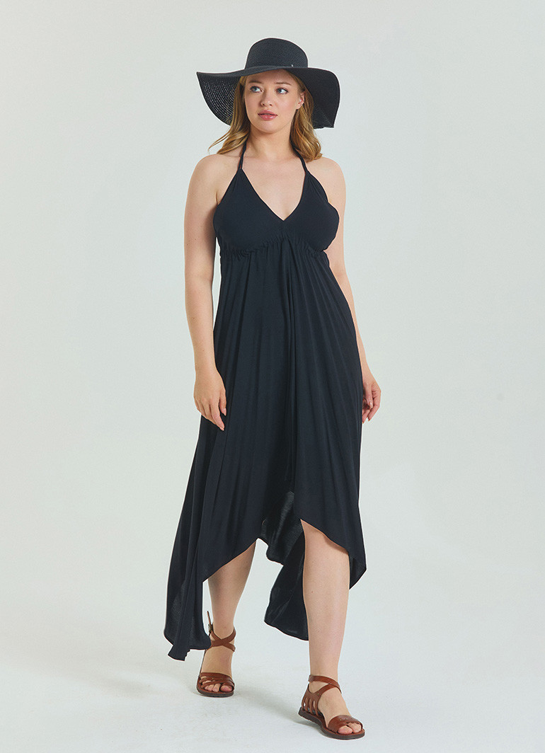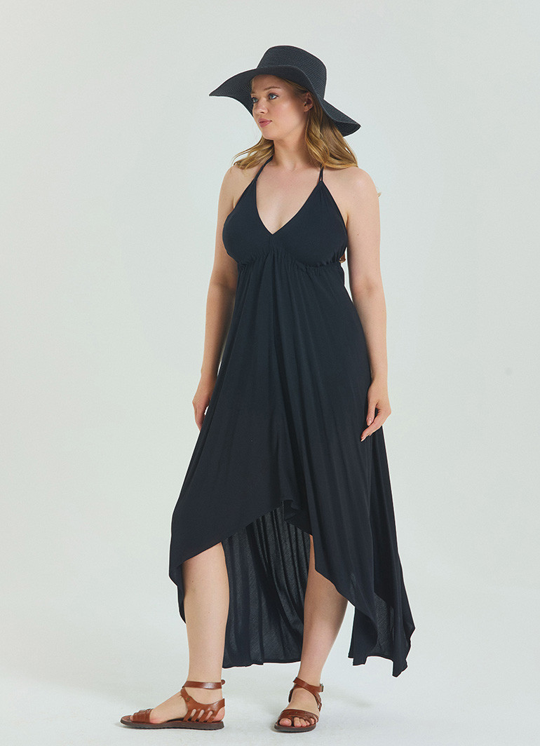 Zarafeti ve rahatlığı bir araya getiren bu siyah büyük beden elbise, V yaka ve sırtı açık tasarımıyla feminen bir duruş sergiler. Boyundan bağlamalı formu ve ayarlanabilir askıları sayesinde farklı vücut tiplerine kolayca uyum sağlar.