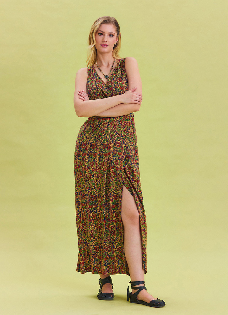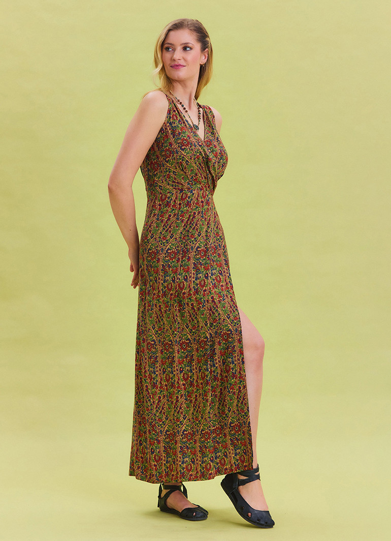 V Yaka Yırtmaç Detaylı Desenli Yeşil Uzun Elbise 6774, yaz mevsiminin tazeliğini ve enerjisini yansıtan modern bir tasarıma sahiptir. Zarif V yaka ve yırtmaç detayları, elbiseye hem şıklık hem de hareket özgürlüğü katar.